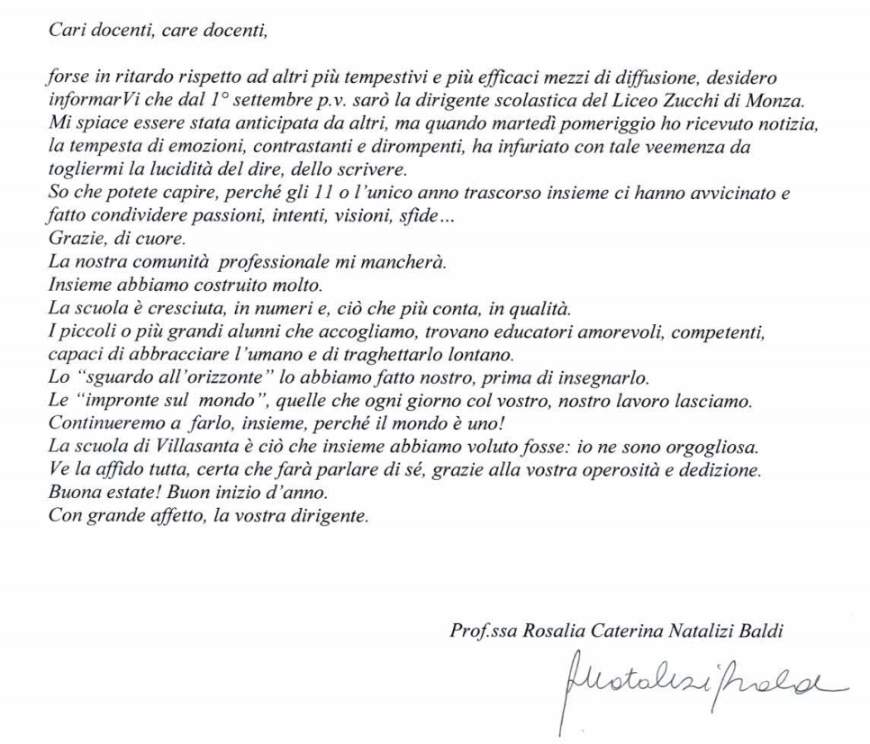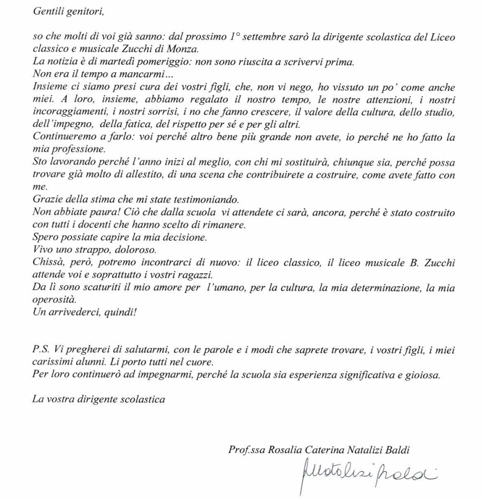 Infatti la preside Rosalia Natalizi Baldi, a partire da settembre, assumerà il nuovo incarico di dirigente scolastico al liceo classico Zucchi di Monza.