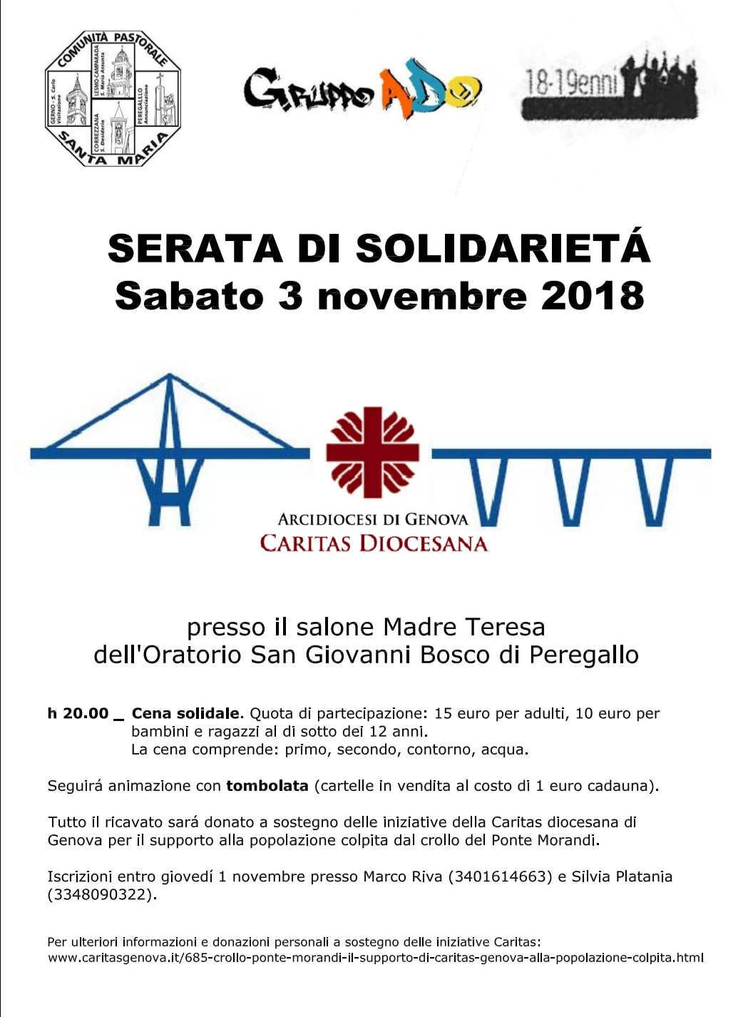 Lo scopo della serata è quello di raccogliere fondi a sostegno delle iniziative della Caritas diocesana di Genova per il supporto alla popolazione colpita dal crollo del ponte Morandi, avvenuto lo scorso 14 agosto (per ulteriori informazioni messe in campo dalla Caritas di Genova clicca qui)