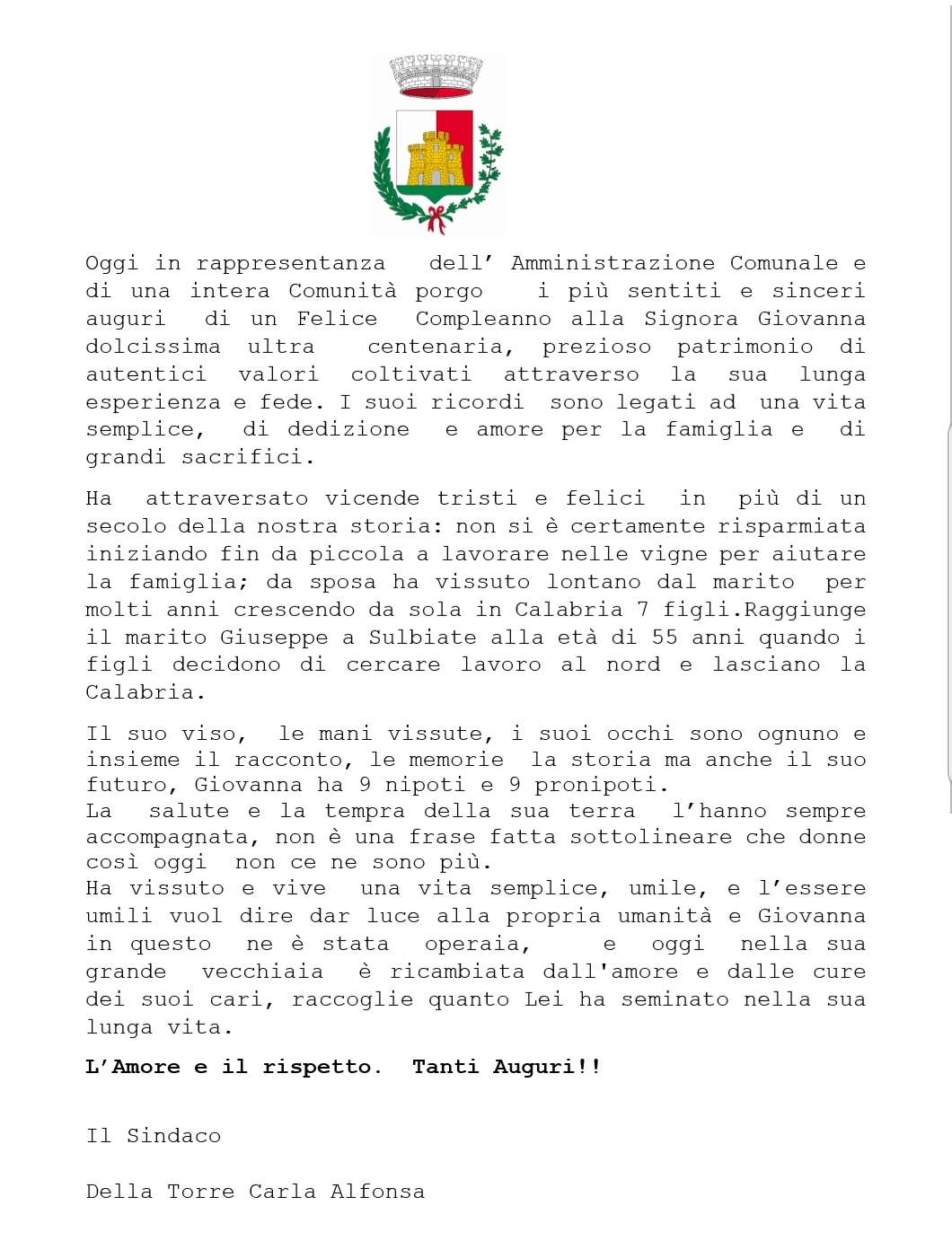 Ecco gli auguri a nonna Giovanna da parte del sindaco Carla Della Torre e della sua Giunta