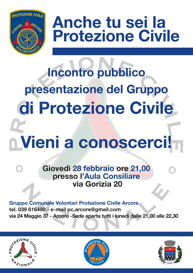 Sono invitati a partecipare all’incontro tutti i cittadini arcoresi, in particolare coloro che vorrebbero entrare nella grande famiglia della Protezione civile arcorese.