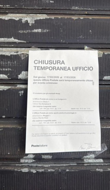 Dall’Ufficio comunicazione di Poste Italiane hanno confermato l’intrusione notturna. “Sono in corso gli accertamenti e le verifiche dei Carabinieri, anche tramite le telecamere”, ci è stato detto. Gli uomini dell’Arma sono al lavoro per risalire ai responsabili. Ad agosto sempre il centro di via Galli era stato colpito da un raid vandalico. In quel caso erano stati rotti i vetri e messe fuori uso le auto per consegnare la corrispondenza. A ottobre il blitz dei Carabinieri, invece, era riuscito a sventare la rapina all’Ufficio postale di San Giovanni Battista, in via Sempione. Nelle scorse settimane numerose le intrusioni in diverse attività cittadine.