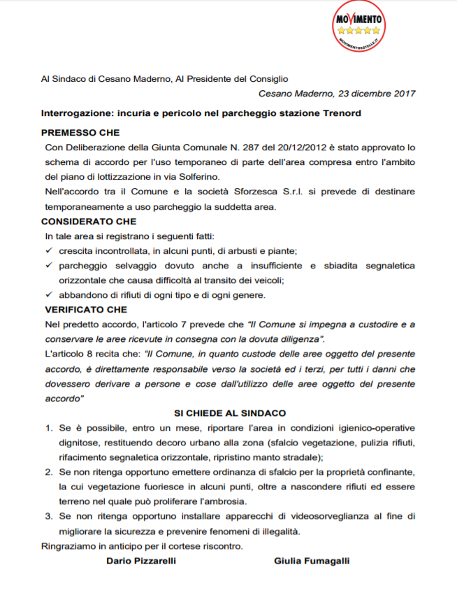 Il Movimento 5 Stelle ha protocollato un’interrogazione in merito al degrado nel parcheggio della stazione Trenord di Cesano Maderno. Se ne parlerà nel prossimo Consiglio Comunale.