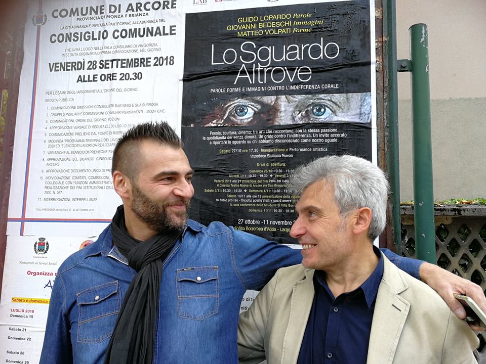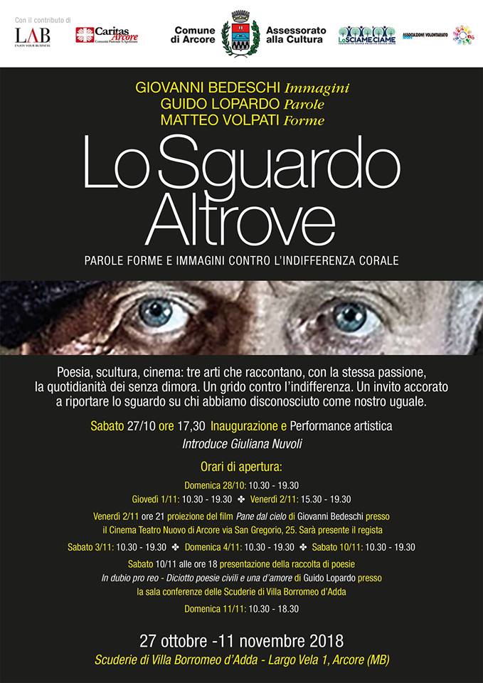 Il progetto della mostra “Lo sguardo altrove – Parole, Forme e Immagini contro l’indifferenza corale” nasce dalla sinergia artistica di uno scultore (Matteo Volpati), di un poeta (Guido Lopardo) e di un regista (Giovanni Bedeschi) che hanno dato espressione a una stessa sensibilità, ognuno attraverso la propria disciplina.