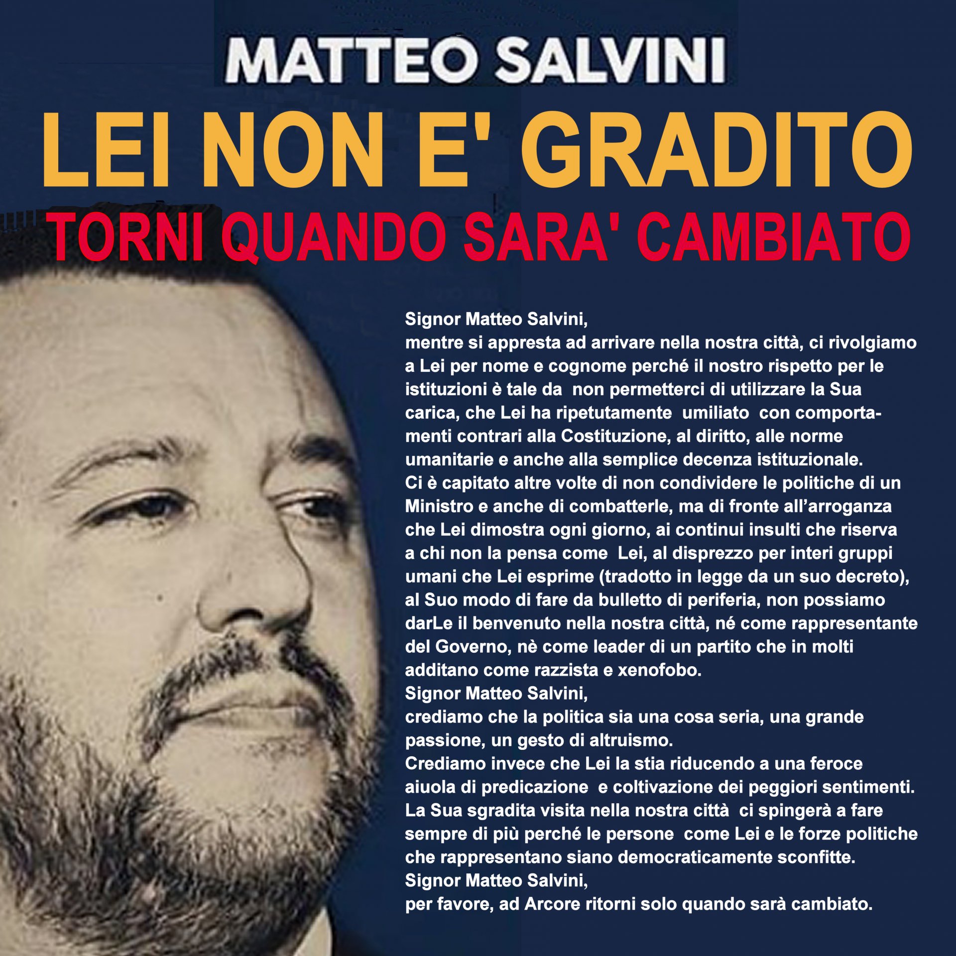 Signor Matteo Salvini, crediamo che la politica sia una cosa seria, una grande passione, un gesto di altruismo. Crediamo che Lei la stia riducendo a una feroce aiuola per vendette personali, predicazione di odio, coltivazione dei peggiori sentimenti di cui sono capaci gli esseri umani. La Sua visita nella nostra città non sono non ci è gradita, ma ci spingerà a fre sempre di più perché persone come Lei e forze politiche che esprimono i Suoi modi di fare siano democraticamente sconfitte. Signor Matteo Salvini, per favore, non torni più”.
