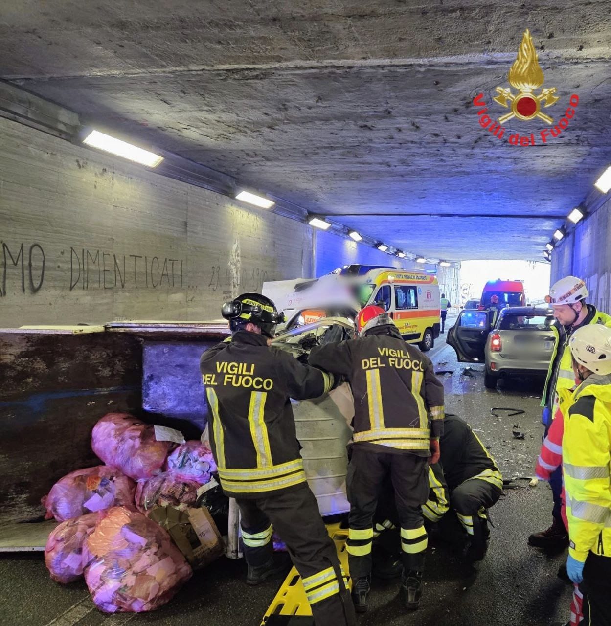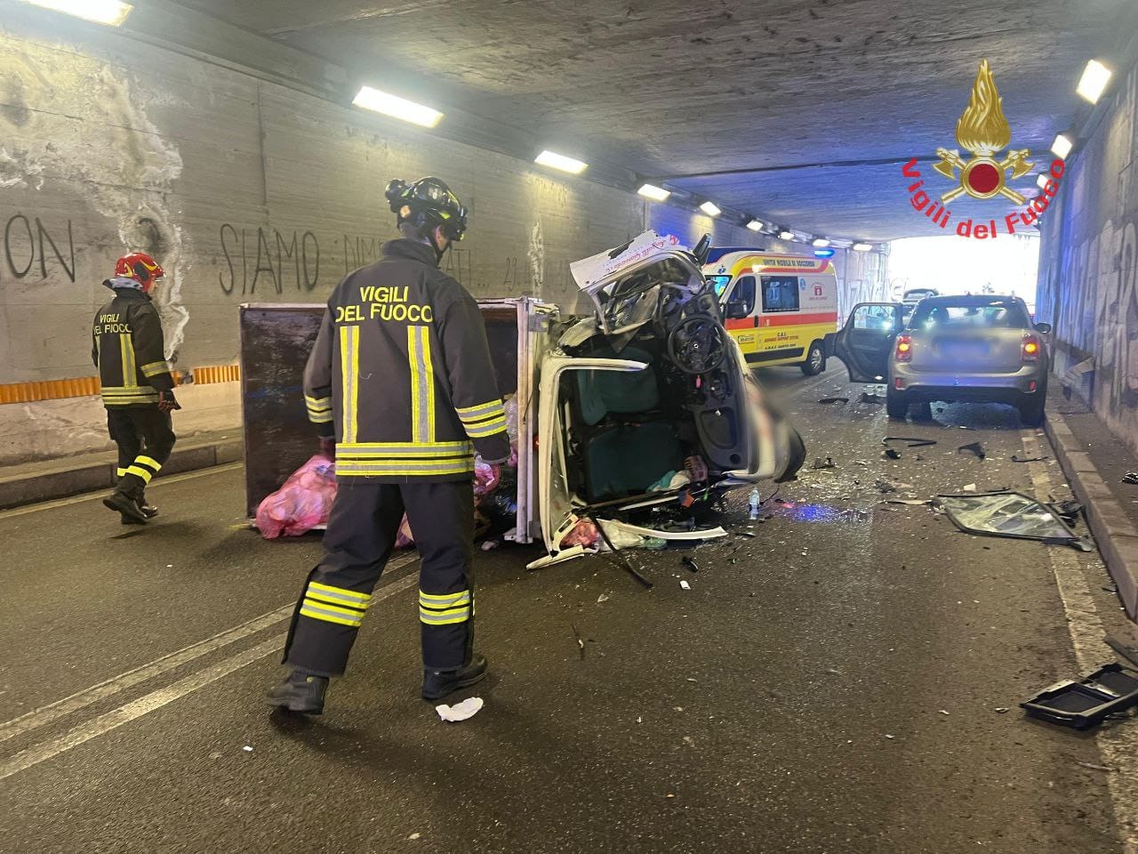E’ stato necessario l’intervento dei Vigili del Fuoco per estrarre il conducente del mezzo adibito al trasporto dei rifiuti che si è ribaltato in galleria dopo essere entrato in collisione con un altro mezzo per cause ancora da accertare.