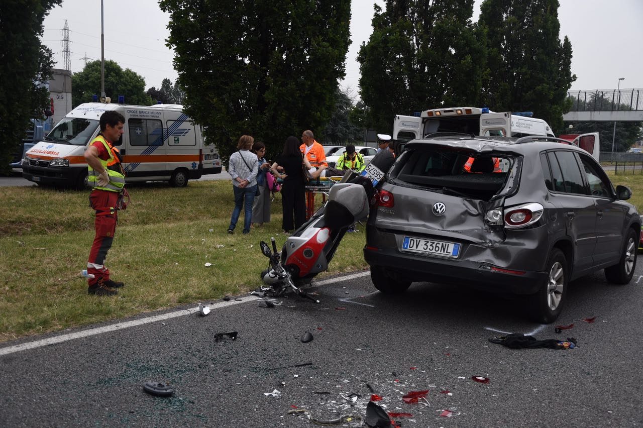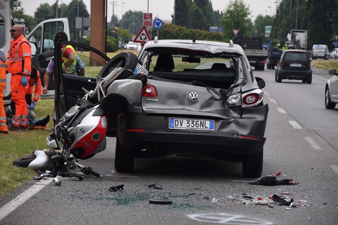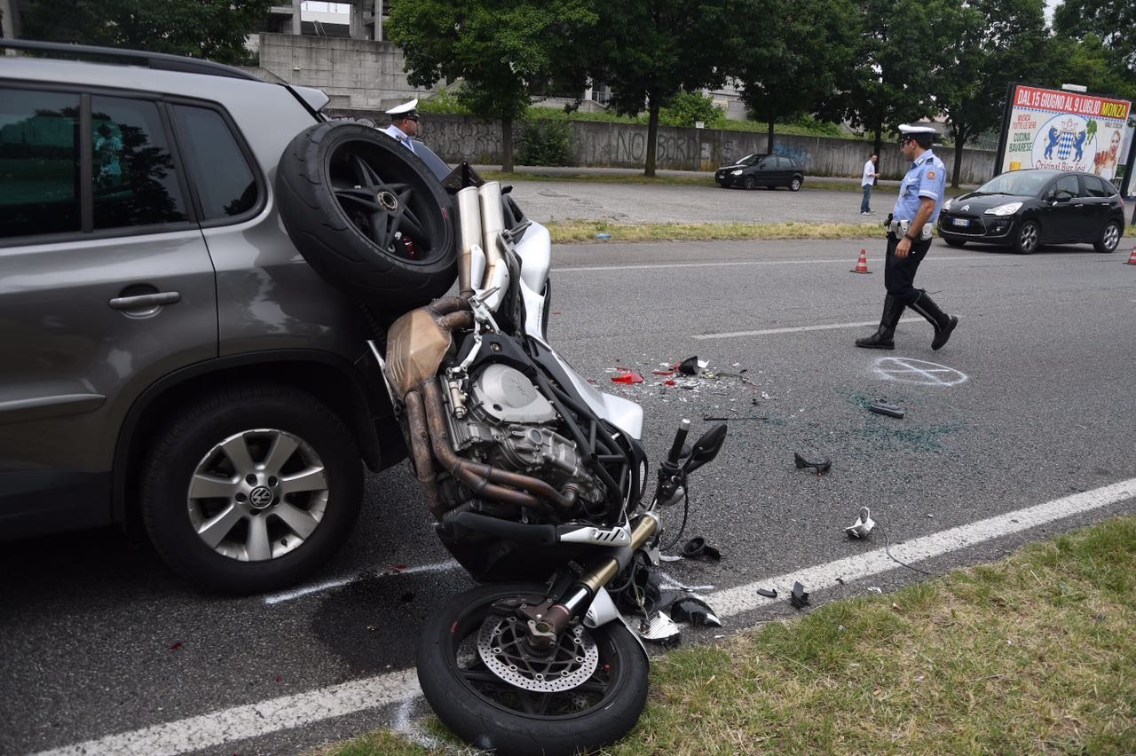 Pauroso scontro poco prima di mezzogiorno a Monza, davanti allo stadio. Una moto Mv Agusta Brutale è finita contro la Volkswagen Tiguan che la precedeva.