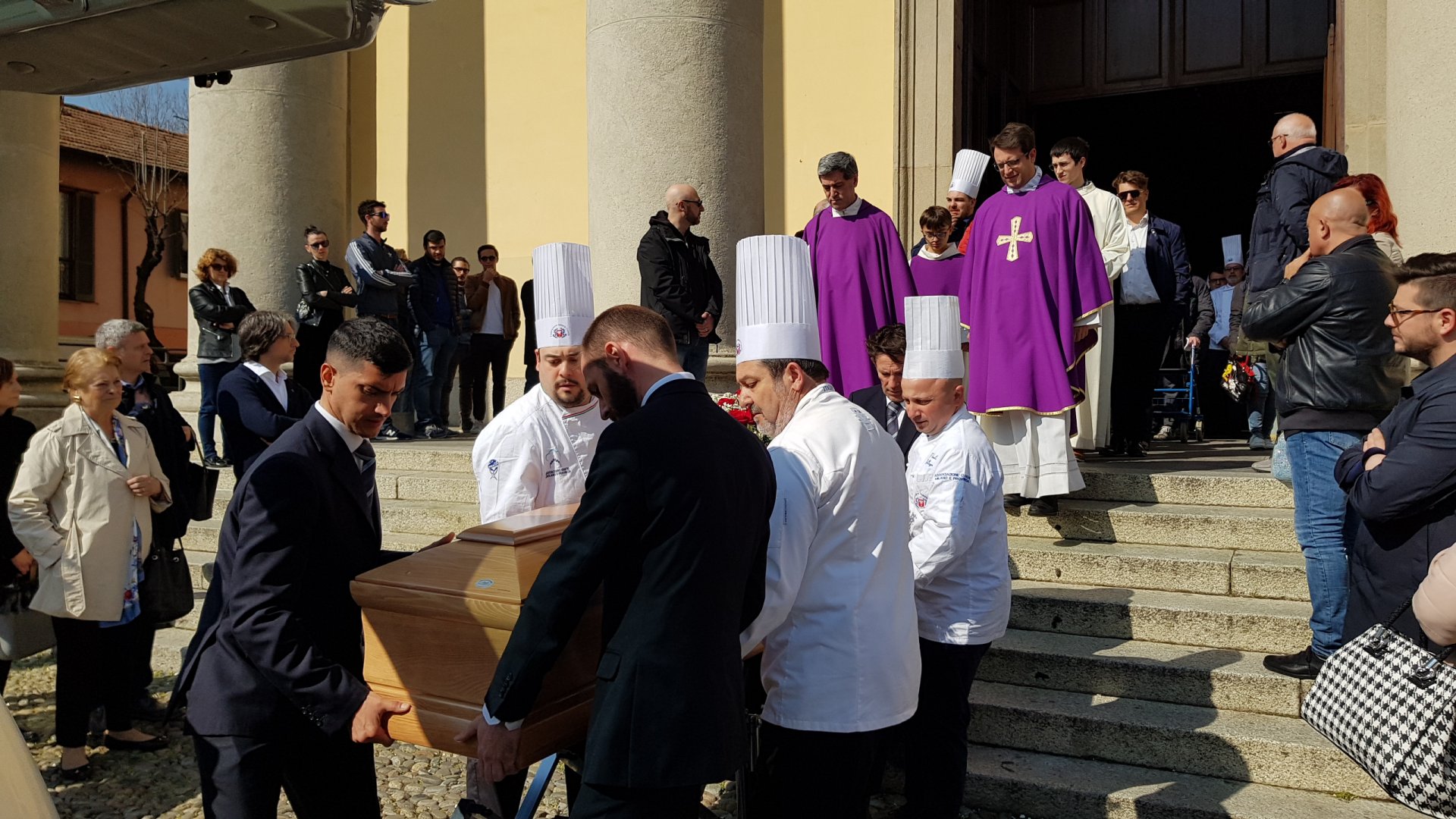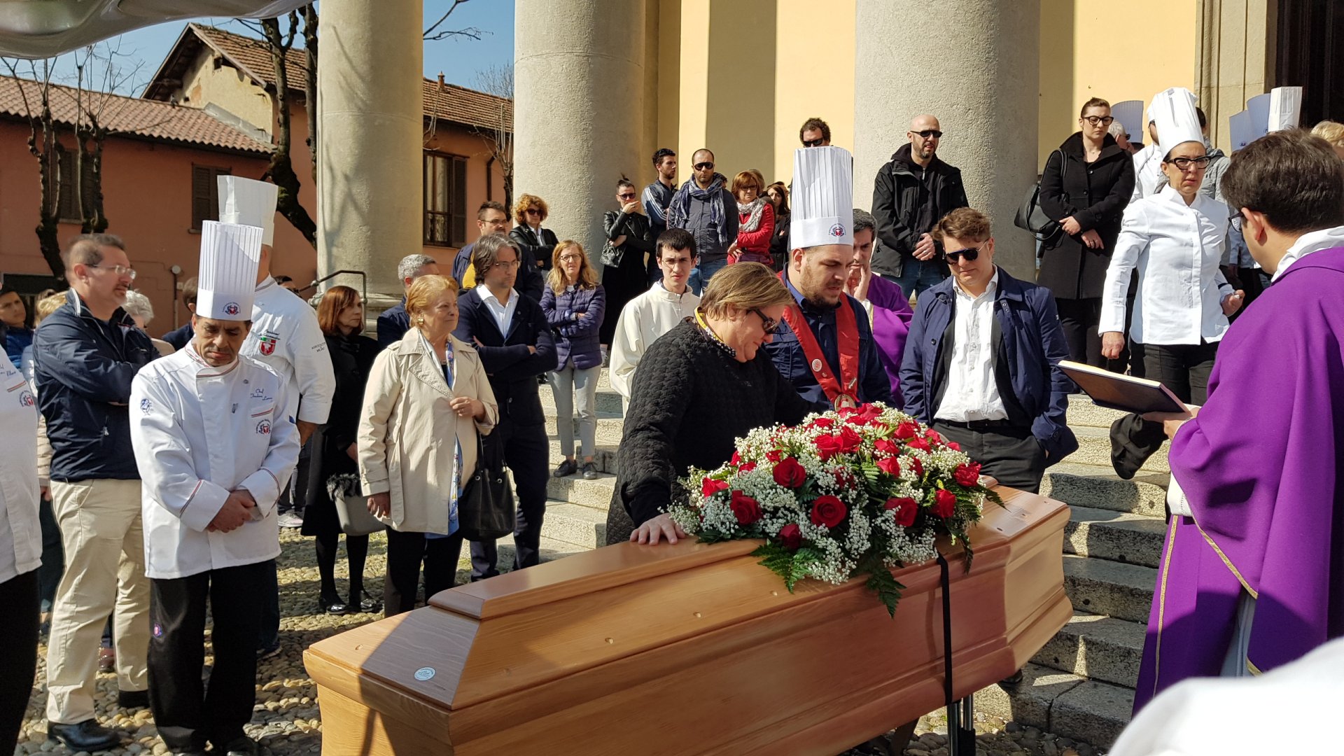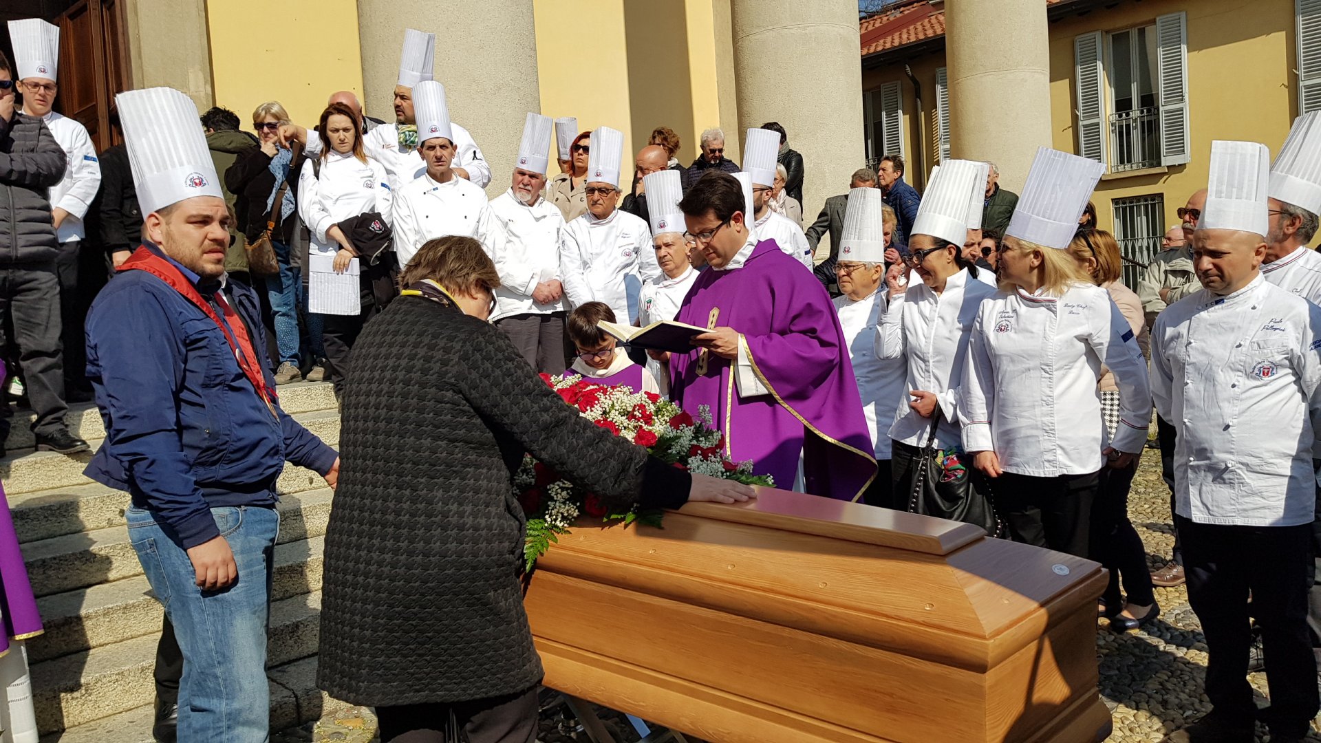 In prima fila, accanto al feretro, vicino alla moglie Antonella e al figlio Matteo, c’erano anche oltre una trentina di chef colleghi di Nesi che hanno partecipato alle cerimonia con la giacca bianca e il cappello da Chef.