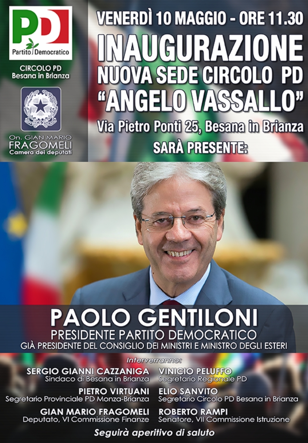 Venerdì prossimo, 10 maggio, l’ex premier Paolo Gentiloni, attuale Presidente del Partito Democratico e Presidente del Consiglio dei Ministri nella scorsa Legislatura, arriverà a Besana per l’inaugurazione della nuova sede del Circolo Pd intitolata ad Angelo Vassallo, il “Sindaco pescatore”, esempio assoluto di rigore morale e di amore per la propria terra, barbaramente assassinato nel settembre del 2010.