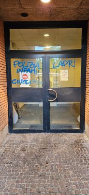 Immagini che mostrano nella serata un uomo, a volto scoperto, avvicinarsi alle vetrine degli uffici, ormai chiusi, nel tentativo di entrare. Non molto tempo dopo una persona con le stesse caratteristiche fisiche e sostanzialmente gli stessi indumenti, viene immortalato mentre torna sul posto, con un cappuccio sulla testa per coprire il volto. Pochi istanti e si avventa sulle vetrate coprendole con le scritte. Prima da una parte e poi dall’altra.