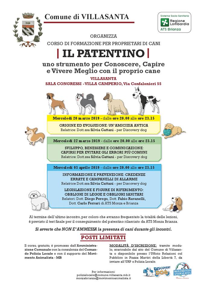 Un «patentino» per chi ha un cane. E’ questa la novità introdotta quest’anno dall’Amministrazione comunale di Villasanta che organizza un corso per i proprietari di fido. Il corso è promosso in collaborazione con la Polizia locale di Villasanta e il Movimento Animalista.