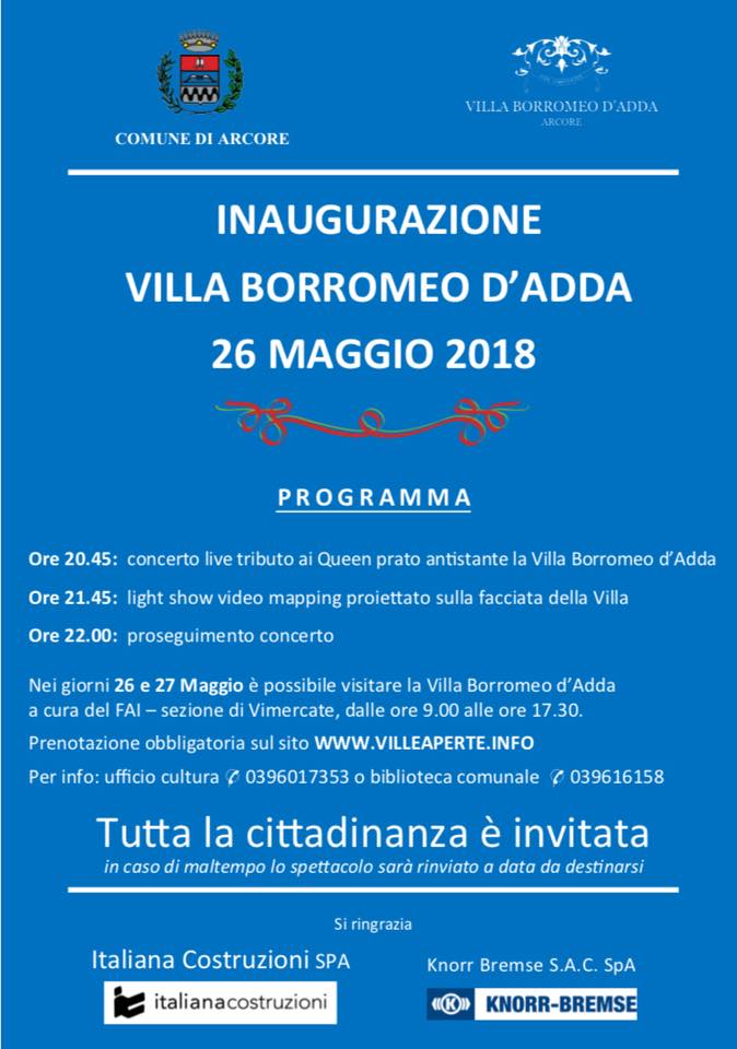L’Amministrazione comunale ha pensato bene di organizzare, per le ore 20.45 di sabato 26 maggio, nel pratone antistante la Villa Borromeo un concerto live tributo ai Queen. Si tratta di un evento inserito nei festeggiamenti per l’inaugurazione della Villa di delizia che verrà riaperta alla cittadinanza dopo i lavori di restauro. (leggi qui)