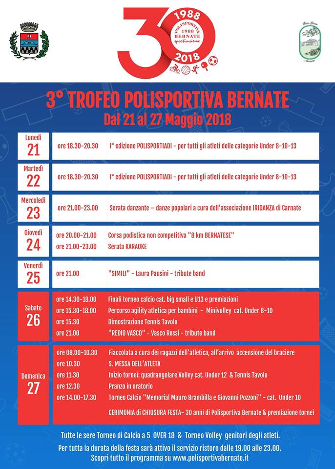 Ma durante lo stesso week end anche la parrocchia di Bernate vivrà il culmine dei festeggiamenti per il 30esimo della fondazione della Polisportiva Bernate.