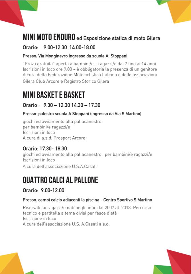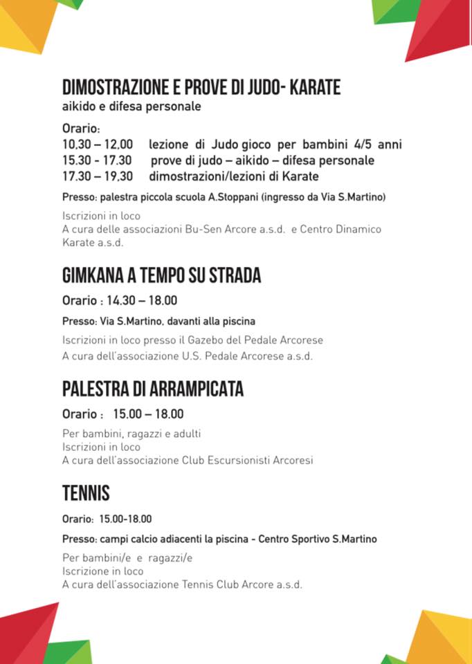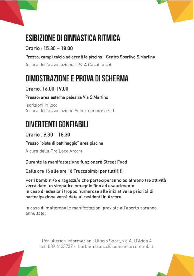 “So bene della coincidenza con la vostra settimana della Polisportiva; con il vostro presidente Giulio Riboli, presente anche in Consulta Sportiva, abbiamo cercato di trovare una soluzione ma purtroppo questo weekend era l’unico disponibile per avete una maggiore adesione delle associazioni sportive arcoresi e prima della chiusura delle scuole.