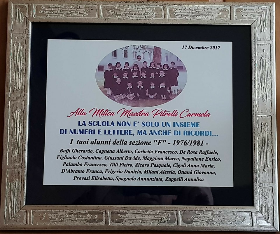 La rimpatriata è stata suggellata dalla consegna di un dono alla maestra: una targa ricordo, con la foto di classe di allora, tutti i nomi dei suoi ex alunni (venti in tutto) e una dedica piena di affetto: “Alla mitica maestra Carmela Pitrelli. La scuola non è solo un insieme di lettere e numeri, ma anche di ricordi”. “Con tutte le lacrime che ha fatto versare lei ai nostri genitori quando ci dava un brutto voto – scherza Cagnetta – abbiamo voluto pareggiare un po’ i conti e farla commuovere un po’. Speriamo di esserci riusciti”.