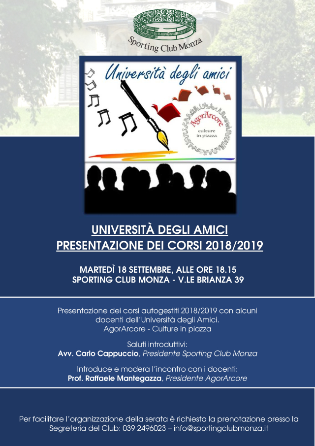 Infatti martedì prossimo, alle ore 18.15 allo Sporting Club di Monza, l’associazione “AgorArcore”, guidata dal docente universitario ed ex assessore alla Cultura di Arcore Raffaele Mantegazza, presenterà i corsi per il nuovo anno accademico.