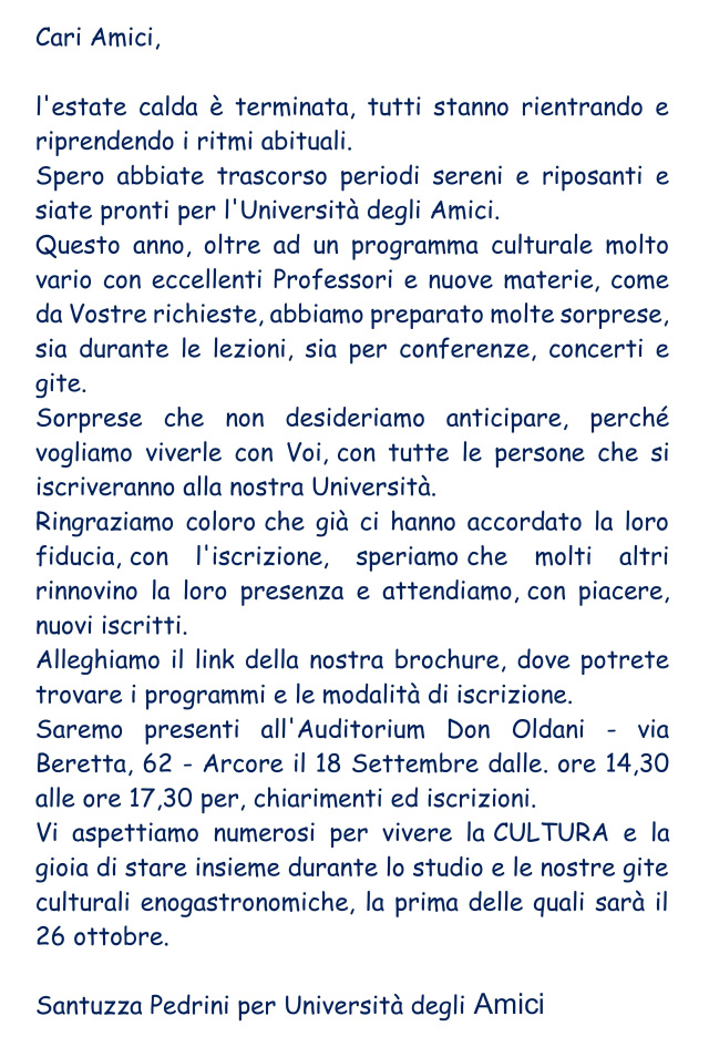 di imparare degli allievi è il nutrimento di chi insegna: perché lo costringeamorevolmente ad approfondire, a programmare, a non essere ripetitivo,a non accontentarsi. Questa Università è stata creata dagli allievi e senza di essi sarebbe solo unbel sogno. La forza, la tenacia, la curiosità e il coraggio degli allievi hapermesso all’Università degli Amici di restare in vita, e anche di crescereulteriormente. L’amore di un allievo è la più grande prova di affetto che unmaestro possa pensare di ricevere. Buon anno di curiosità a tutte e tutti”.
