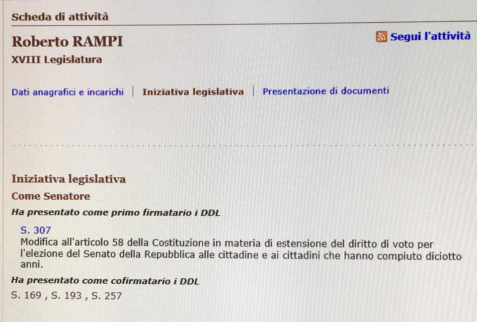 Anche se non c’è ancora un nuovo governo per il paese il neo senatore di Vimercate ha deciso di portare avanti la sua prima proposta di modifica di legge: “La mia prima proposta di legge al Senato riguarda l’estensione del voto anche per la “Camera alta” a tutti i maggiorenni – ha commentato Rampi – Qualcuno storcerà il naso e/o dirà che altre sono le priorità. (La Democrazia è sempre una priorità) Era intanto un impegno preso in campagna elettorale e tanto basterebbe. Ma se bicameralismo paritario deve essere che sia davvero tale”.