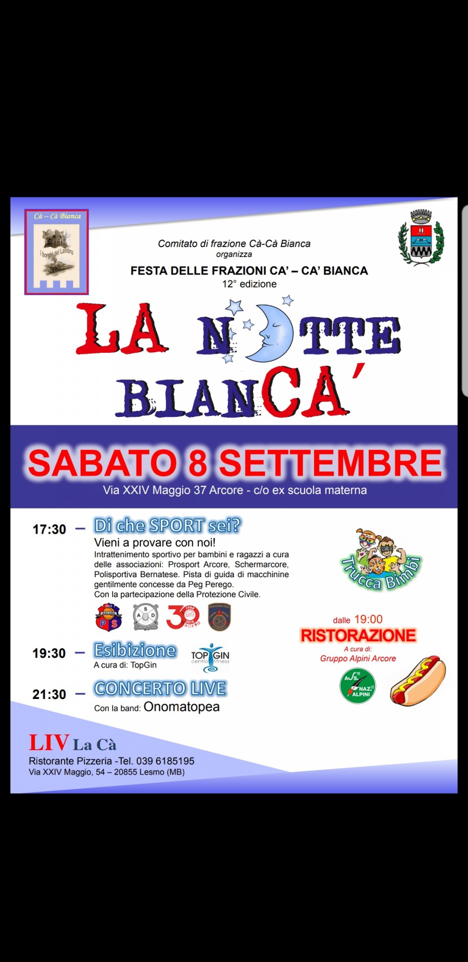 Puntuale, al termine delle vacanze estive, ritorna la dodicesima edizione della “Notte BianCà” organizzata ad Arcore dal Comitato di quartiere Cà e Cà Bianca e con il patrocinio del Comune di Arcore.