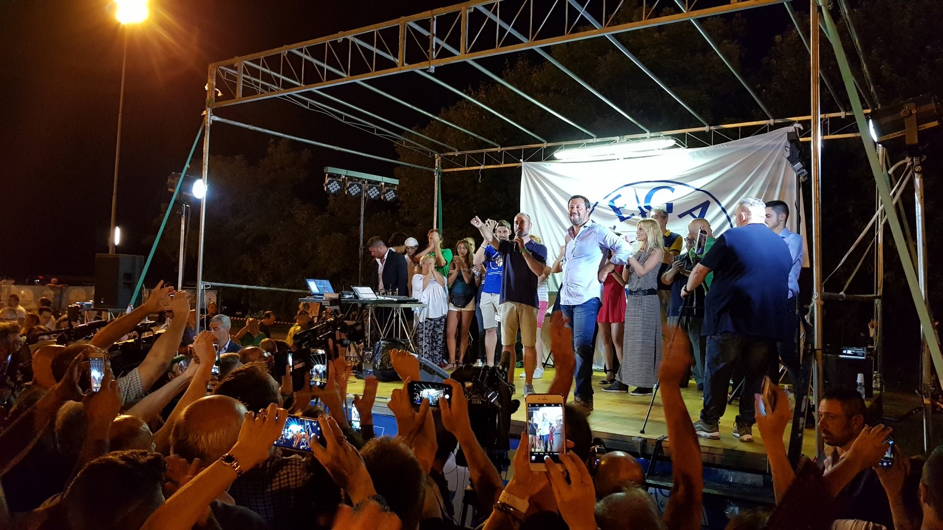 Salvini è arrivato ad Arcore alle ore 21 circa. Dopo essersi concesso ai selfie di rito con i militanti brianzoli del Carroccio, è salito sul palco verso le 21.40 e ha intrattanuto il suo pubblico per oltre mezz’ora.
