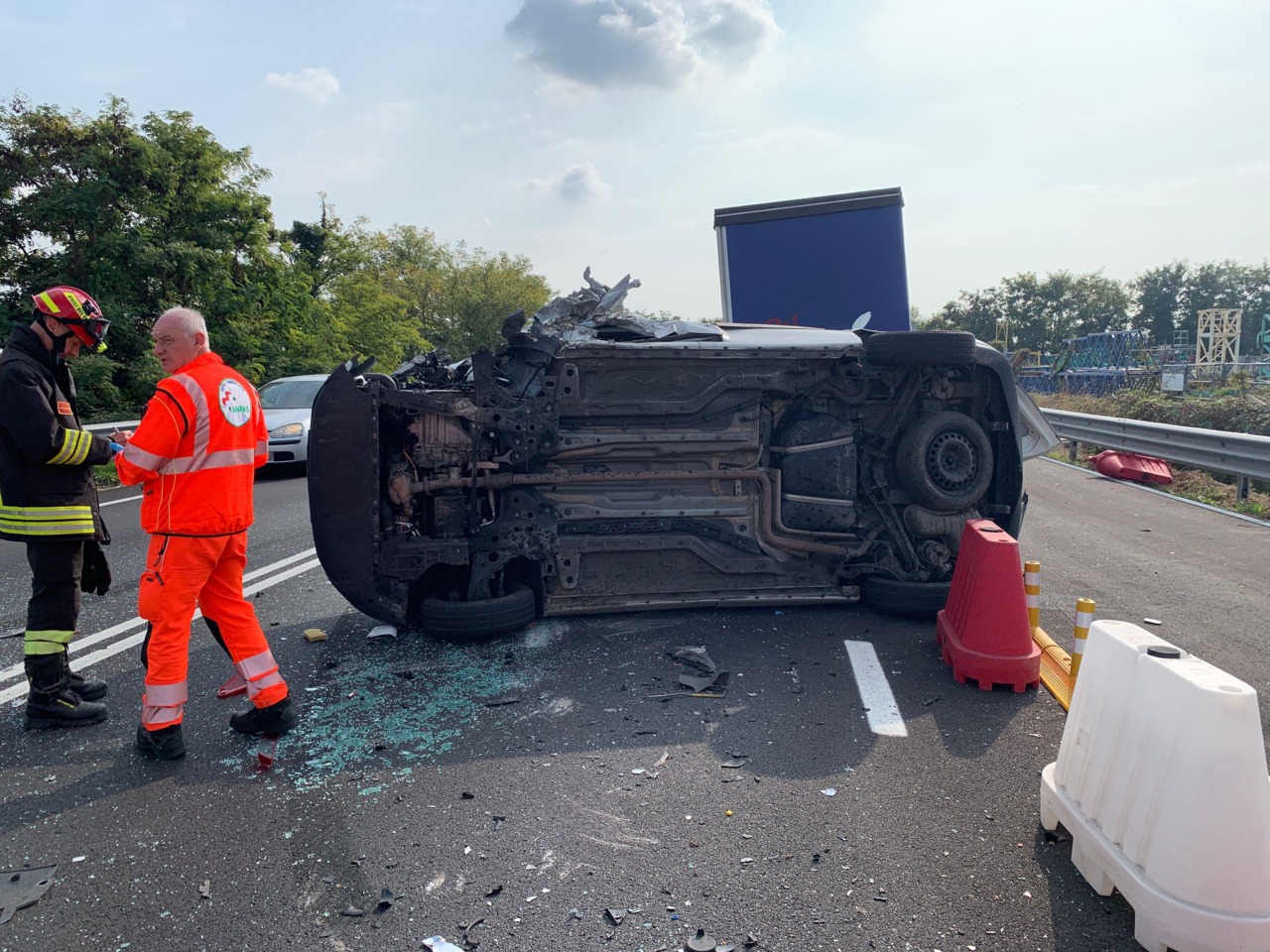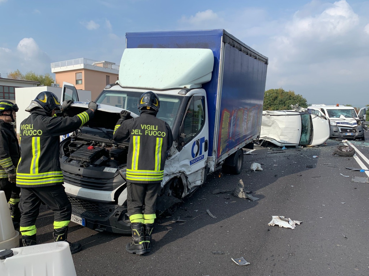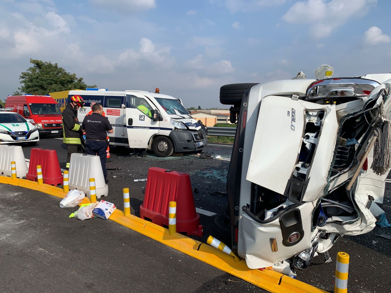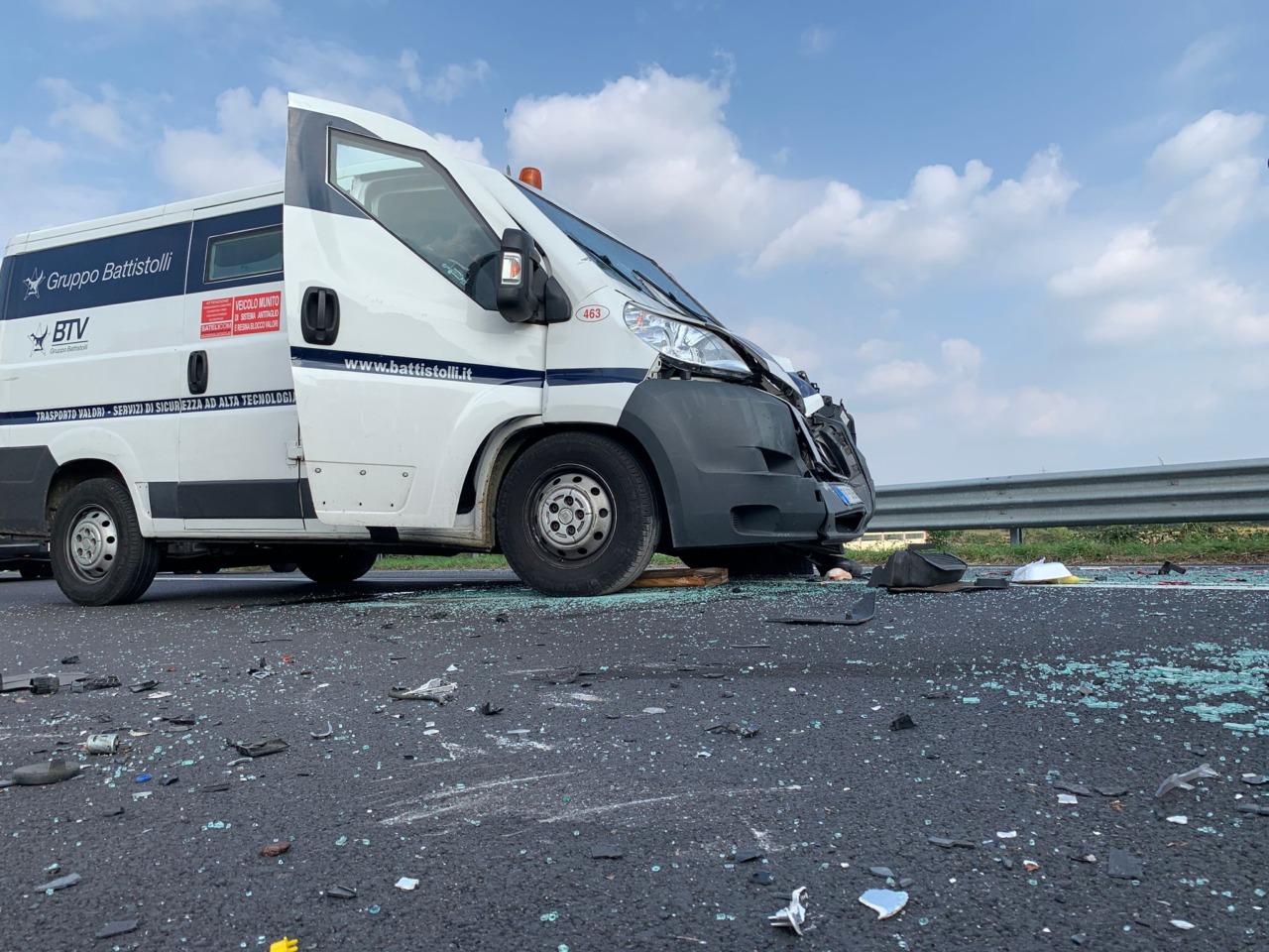 L’allarme è scattato intorno alle 13.30. Stando a una prima ricostruzione dei fatti sembra che a entrare in collisione tra loro siano stati inizialmente due mezzi pesanti, un “Doblò” e un camion, che provenivano da direzioni opposte. Dopo l’impatto, il “Doblò” si sarebbe ribaltato, centrando successivamente in pieno un portavalori che sopraggiungeva dietro il primo camion. Le cause sono ancora in fase di accertamento, ma gli impatti sono stati violentissimi.