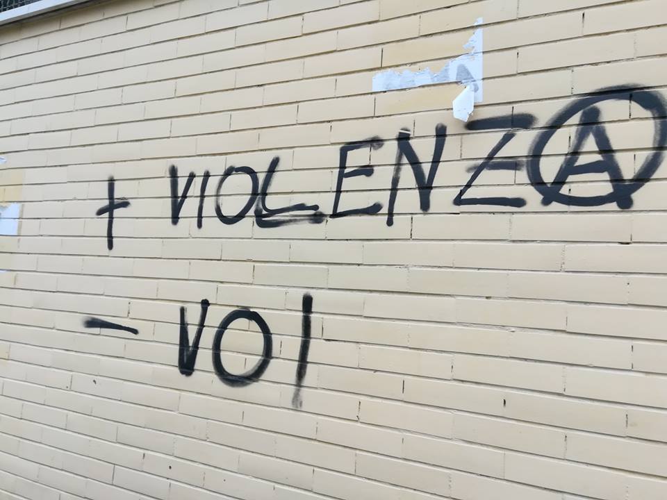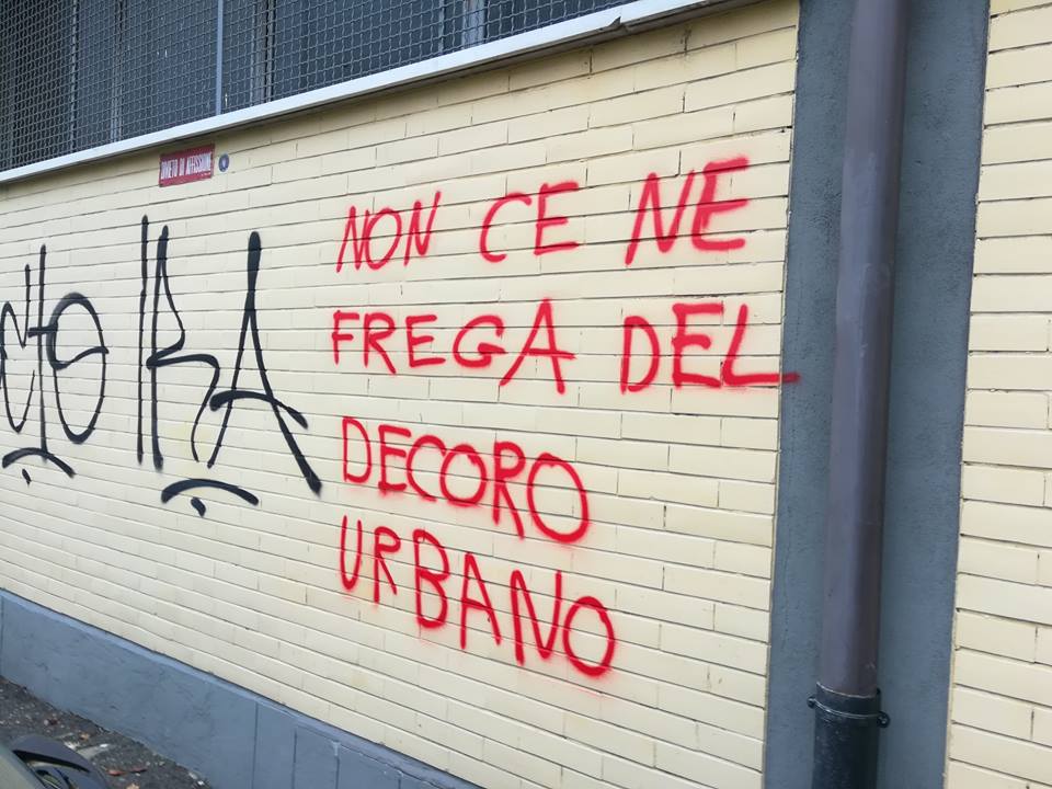 A qualche centimetro di distanza dalle scritte rivolte al leader della Lega, sempre in rosso compare un’altra scritta che sembra decisamente rivolta alla città e quanti si adoperano, compresa l’Amministrazione comunale, per la sua pulizia. Da un’altra parte della facciata campeggia un’altra frase, scritta questa volta con una bomboletta spray nera, con un messaggio eloquente e di chiaro incitamento all’odio.