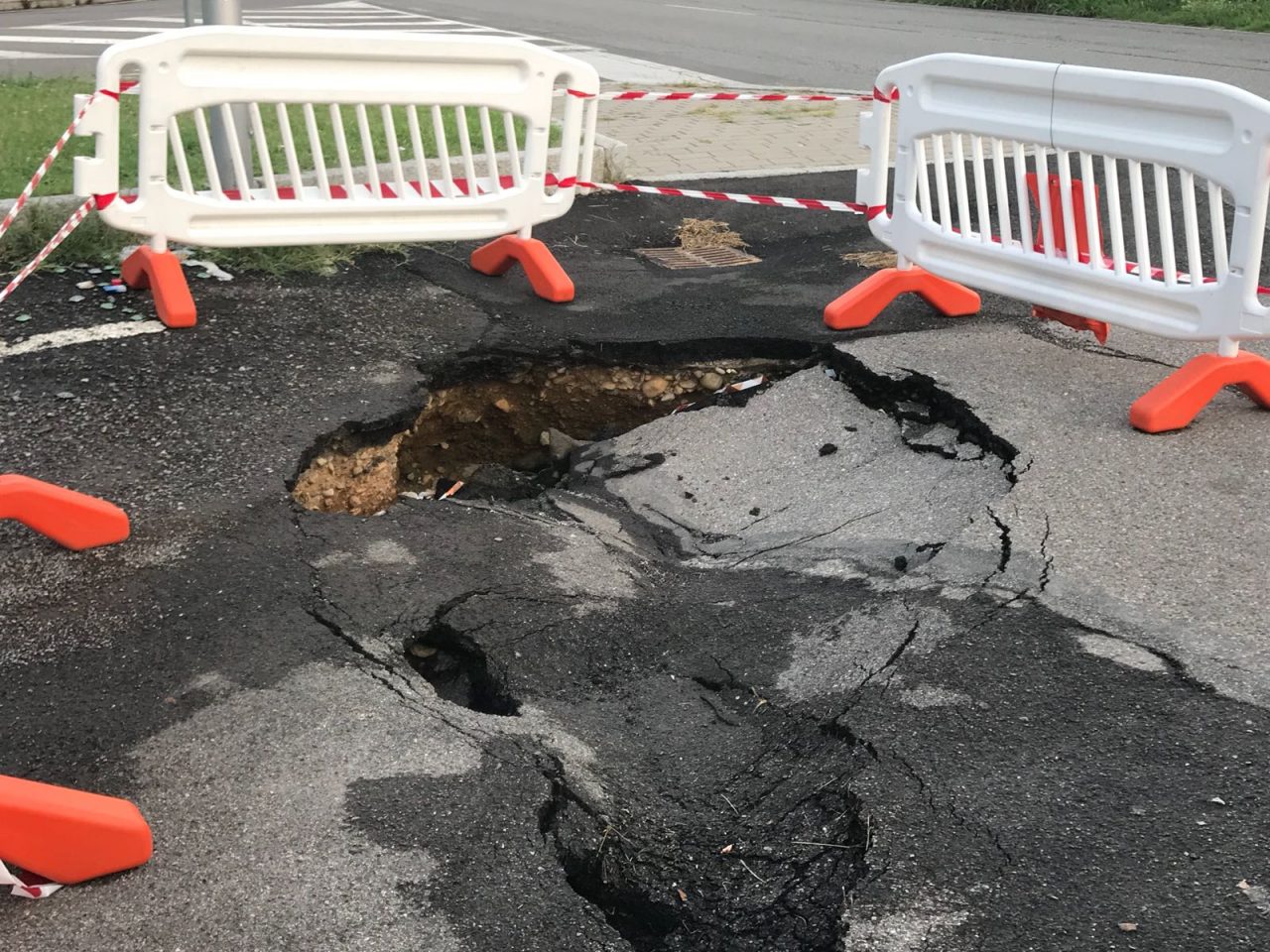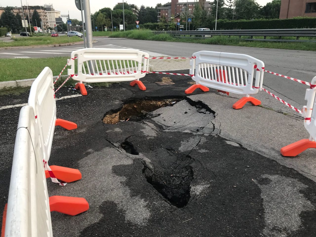 Si apre voragine in viale Elvezia e il Comune di Monza è costretto a transennare parte della strada fra il Rondò dei pini e l’allacciamento con la Statale 36 Valassina.