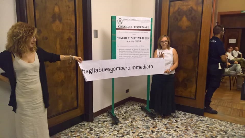 Solo a metà seduta due membri del sodalizio hanno esposto uno striscione polemico fuori dall’aula consigliare, con il  quale chiedono la rimozione immediata degli pneumatici dai piazzali della Tagliabue gomme.