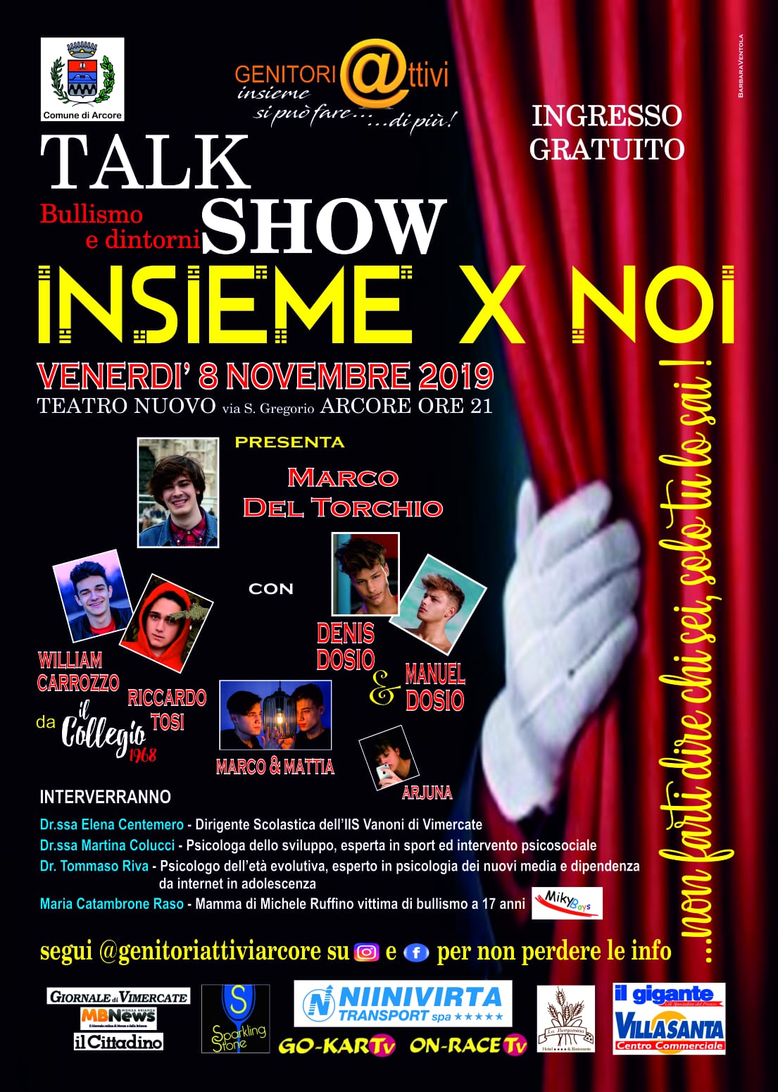 “Insieme x Noi” è il titolo del talk show che sarà presentato da Marco Del Torchio, fotografo delle webstar ed esperto di social con William Carrozzo e Riccardo Tosi protagonisti del reality televisivo “il Collegio”, Marco&Mattia due gemelli molto conosciuti su TikTok e per concludere i fratelli più famosi del momento Denis e Manuel Dosio, influencer, youtuber e webstar.