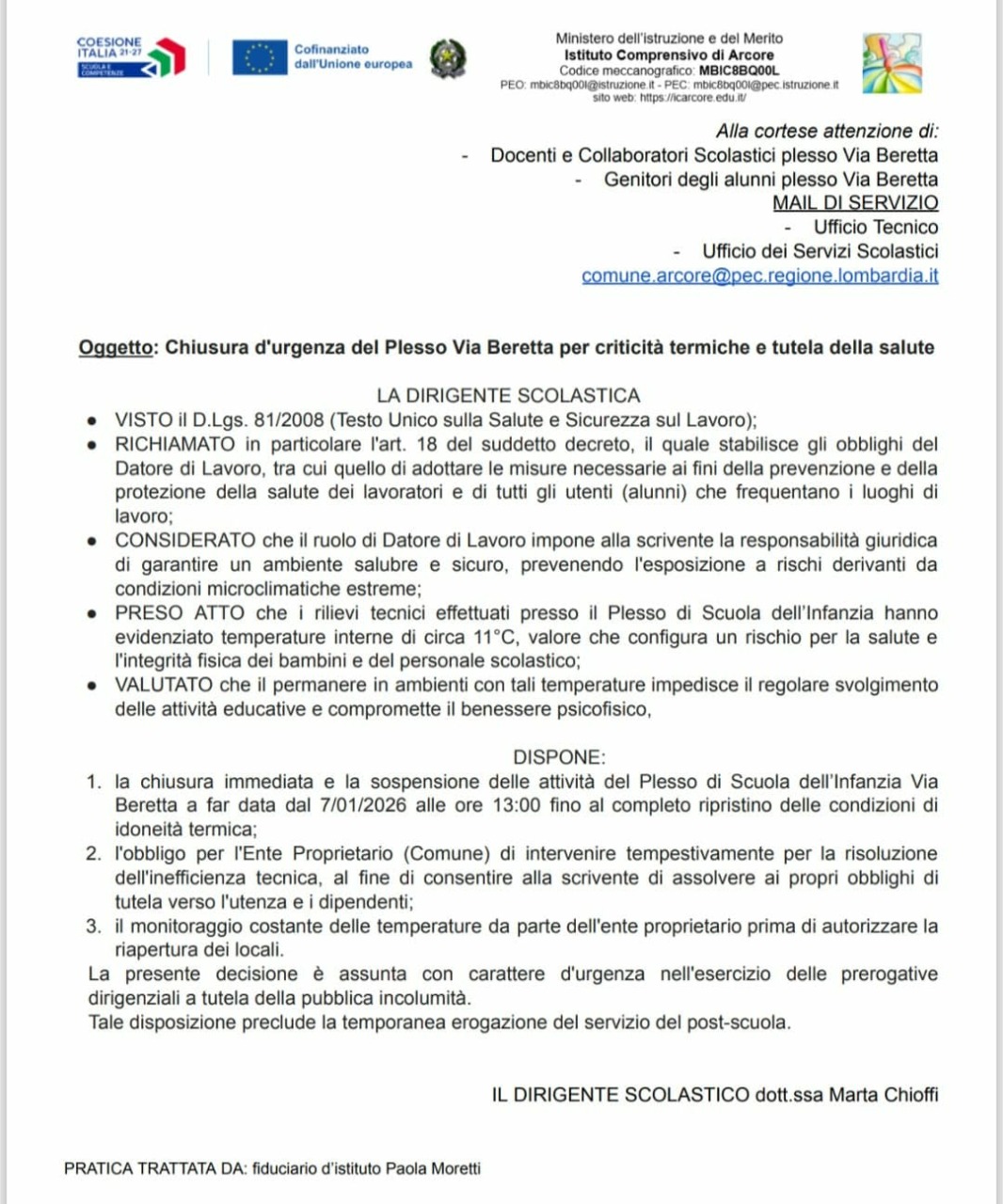 Stamattina, mercoledì 7 gennaio, oltre un centinaio di alunni della scuola dell'infanzia di via Beretta, ad Arcore, sono usciti alle 13 a causa delle temperature basse all'interno del plesso