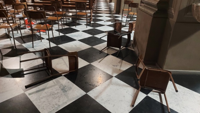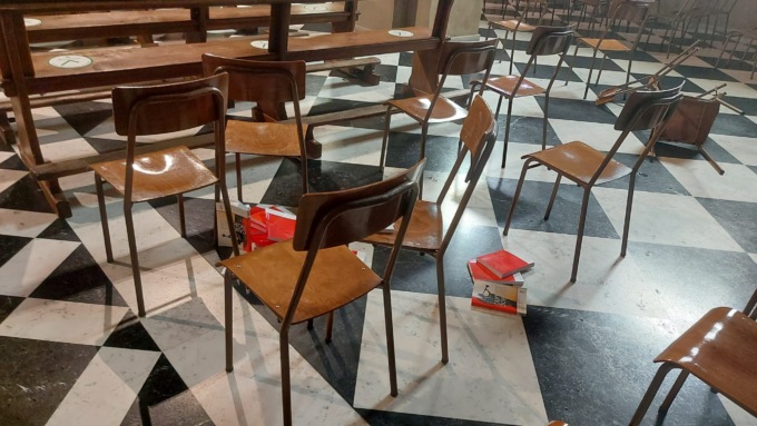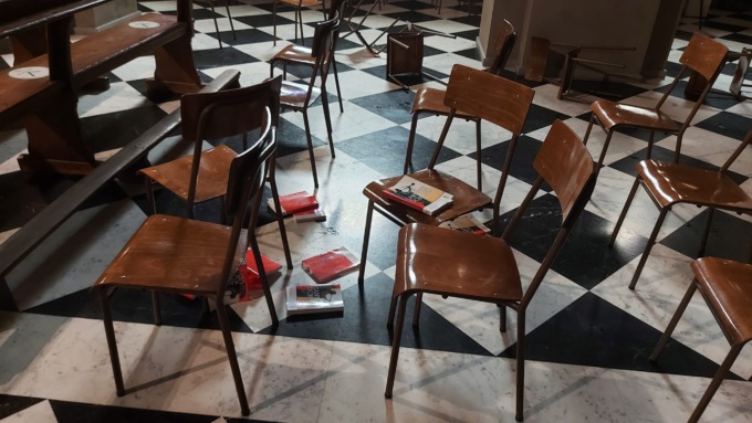 Danneggiato il crocifisso, a terra sedie e libri, rovesciato il gel