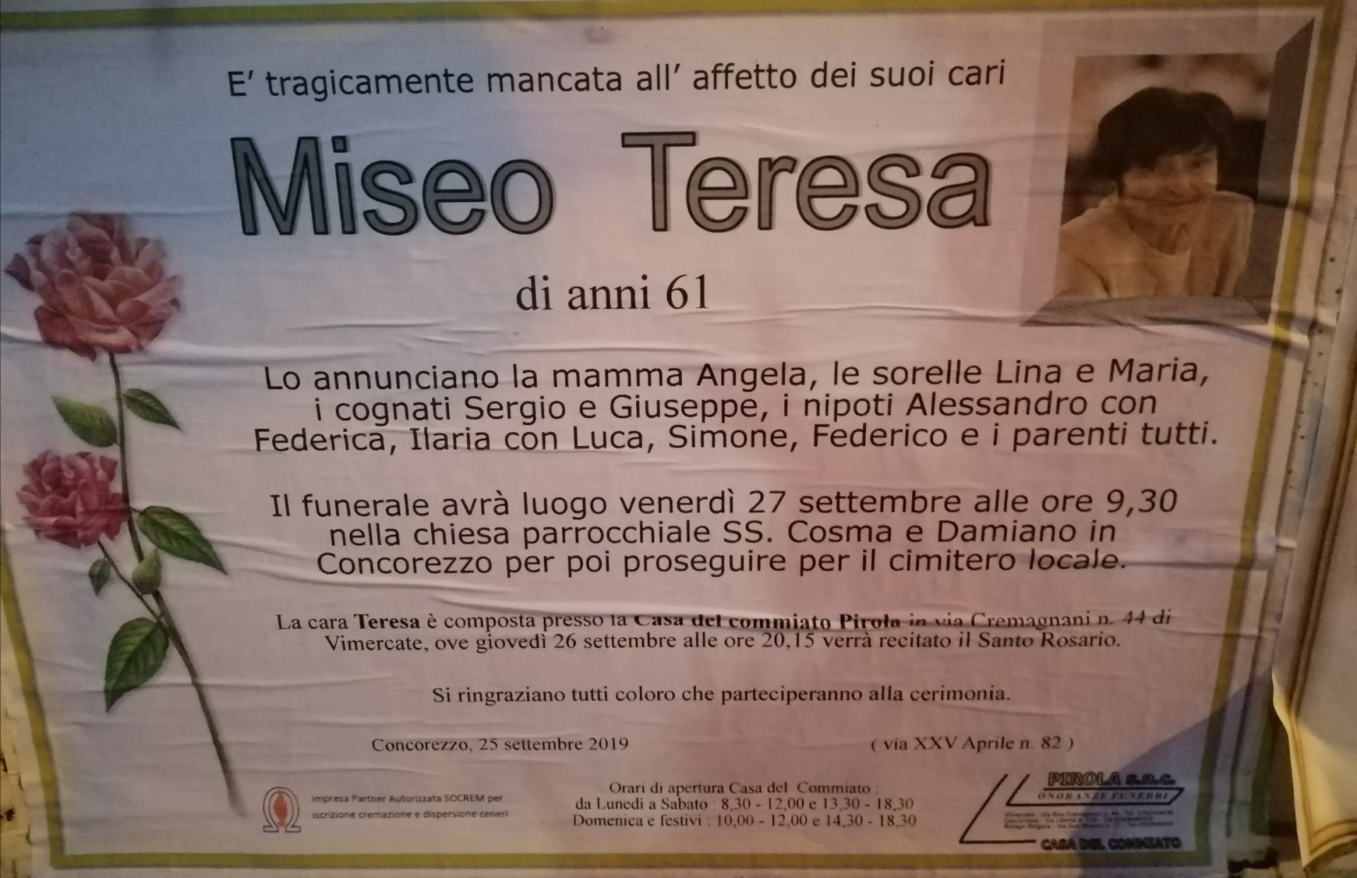 L’estremo saluto a Teresa Miseo verrà tributato domani mattina, venerdì, alle 9.30 nella chiesa dei Santi Cosma e Damiano. Nella serata di ieri, intanto, il Consiglio comunale di Concorezzo ha ricordato la donna con un minuto di silenzio prima dell’inizio dei lavori.