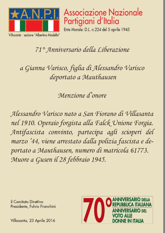 Nell’aprile del 2016, ricordiamo, la sezione Anpi di Villasanta, in occasione del 71esimo Anniversario della Liberazione dell’Italia dalla dittatura nazifascista e nel 70esimo anniversario della nascita della Repubblica italiana e del voto alle donne, conferì la tessera “ad Honorem” a Gianna Varisco, figlia di Alessandro Varisco