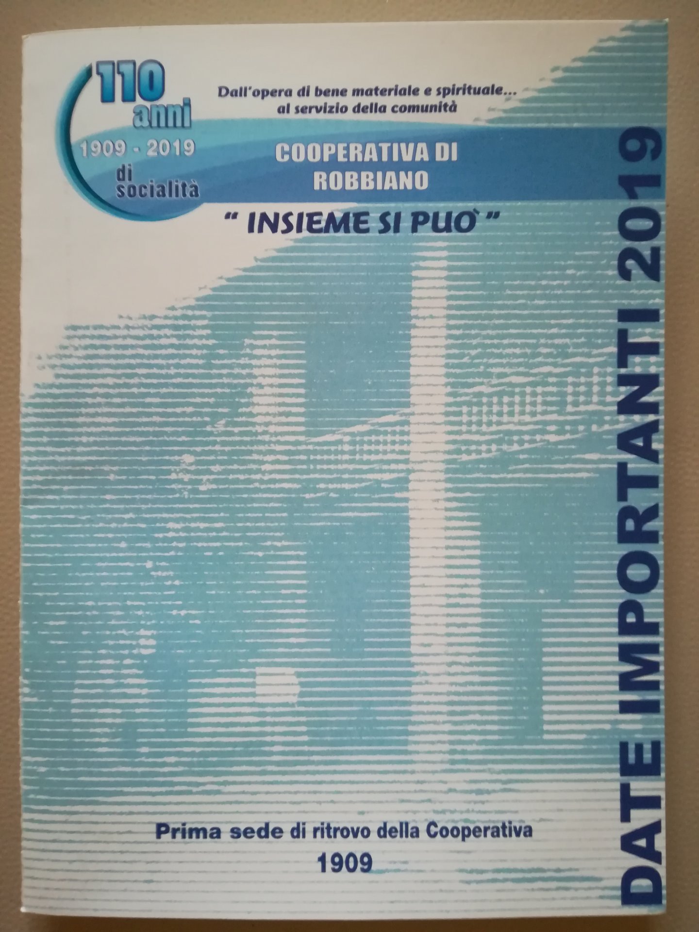 Il promemoria del programma è contenuto in un particolare calendario distribuito ai soci, che oltre al nuovo logo, riporta sul frontespizio la fotografia della prima sede della cooperativa, situata in un locale di ritrovo, dietro la chiesa parrocchiale, ricordata con una targa commemorativa. Le date più significative sono quella del 19 maggio, nella quale si concentreranno i principali eventi, e quella dell’ 8 settembre, quando verrà inaugurata la mostra fotografica Frammenti di storia. Per il 3 febbraio è previsto lo svolgimento della 37ima edizione della Camminata a Robbiano, e sono pure confermate le iniziative sociali legate alle scadenze parrocchiali. Per il capitolo viaggi e turismo, si conferma la prima gita culturale, in marzo con un itinerario lariano.