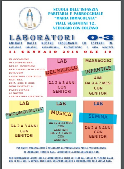Laboratori per i più piccoli. Li organizza la scuola dell’infanzia “Maria Immacolata” di Veduggio sabato 13 gennaio. Appuntamento per mamme e papà dei bimbi nati dal 2015 al 2017 a partire dalle 10, nella struttura di viale Segantini 12.