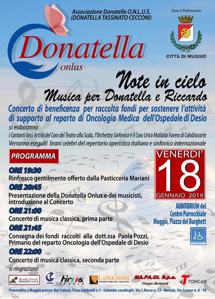 L’associazione «Donatella onlus» ha aperto la prevendita dei biglietti per il concerto benefico «Note in cielo. Musica per Donatella e Riccardo», organizzato con il grande impegno ed energia di Roberta Cecconi, Dario Morlini, Gianfranco Basili.