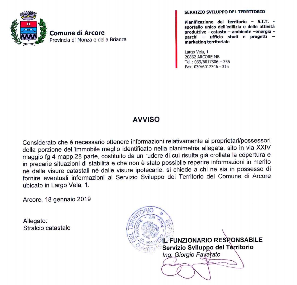 Un appello singolare, dicevamo, che punta ad ottenere informazioni relativamente ai proprietari o possessori della porzione di immobile diroccato. Dunque i vicini di casa o coloro che sono in possesso di informazioni sono invitati a farlo presente agli uffici di Largo Vela.