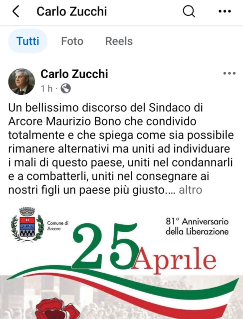Carlo Zucchi, noto esponente del centrosinistra, ha espresso su Facebook il proprio apprezzamento per le parole del Sindaco. Un riconoscimento non scontato che sottolinea come, almeno sul piano dei valori condivisi della Liberazione, Bono sia riuscito a parlare a tutta la città.