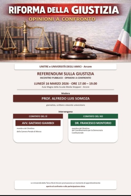 Se cercate un momento di sintesi che metta a confronto le diverse anime del dibattito, l’appuntamento da non perdere è lunedì 16 marzo, dalle 17 alle 19, presso l’Aula Magna della Scuola Media Stoppani. Unitre e l’Università degli Amici di Arcore hanno organizzato un incontro con “opinioni a confronto” moderato dal Prof. Alfredo Luis Somoza. Sarà un’occasione preziosa per ascoltare, nello stesso tavolo, le ragioni del “Sì” con l’Avvocato Gaetano Giamboi e quelle del “No” con il Francesco Montorio che dunque terrà il suo secondo incontro nel giro di due giorni in città.