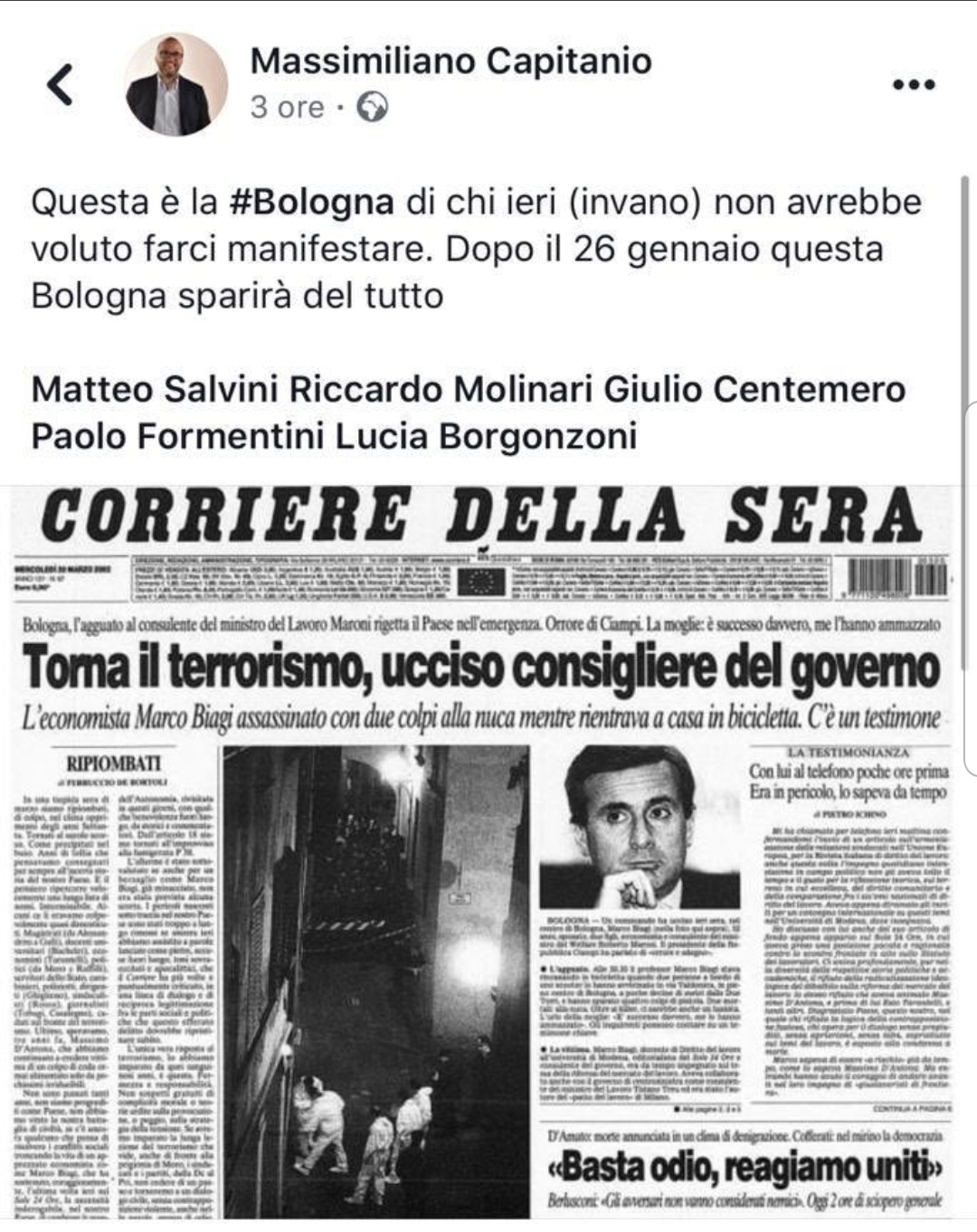 “Questa è la Bologna di chi ieri (invano) non avrebbe voluto farci manifestare. Dopo il 26 gennaio questa Bologna sparirà del tutto”. Ad accompagnare il messaggio una foto della prima pagina del Corriere della sera del 20 marzo 2002 con la notizia dell’assassinio a Bologna di Marco Biagi.