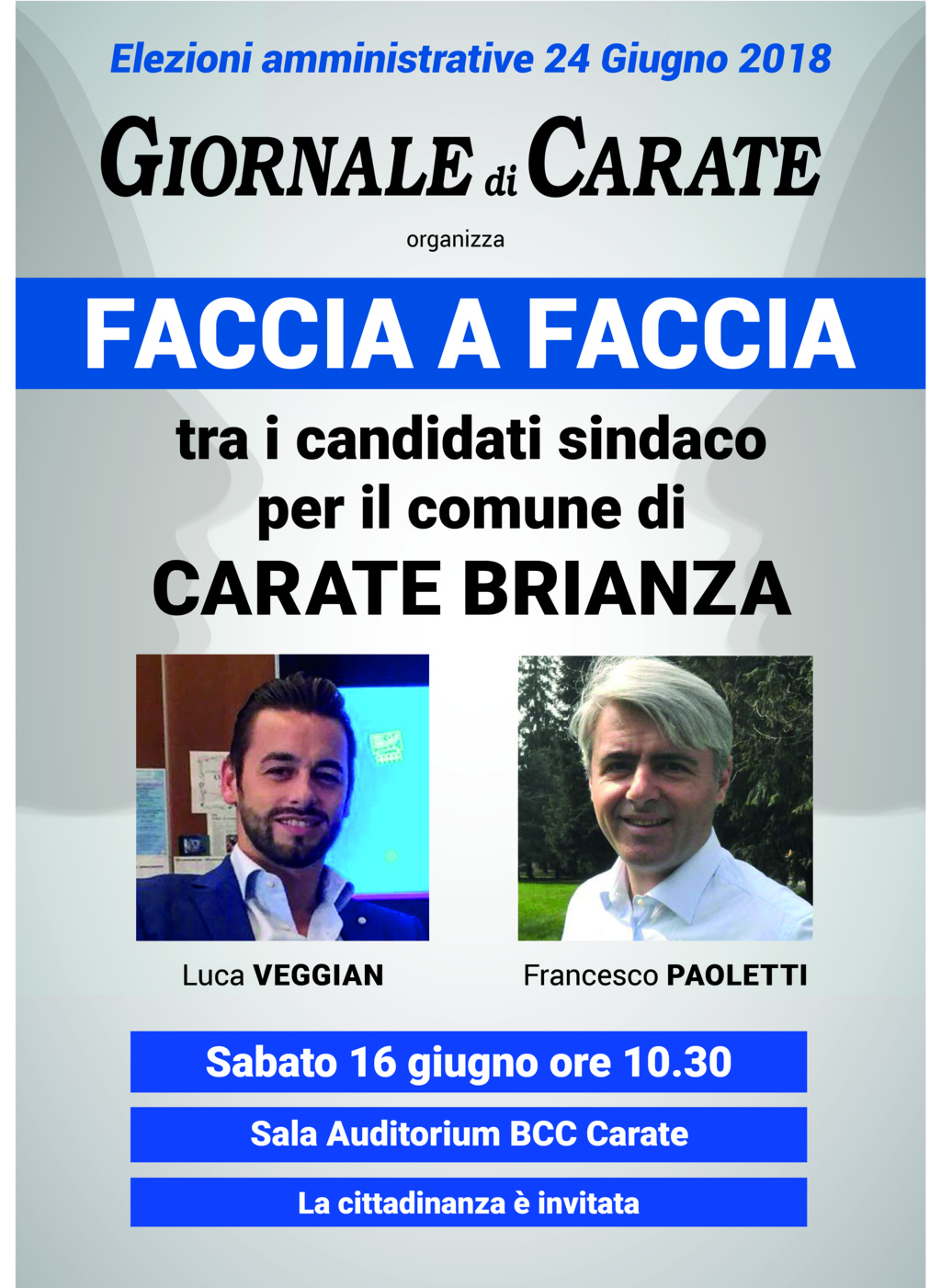 Confronto pubblico in vista del ballottaggio di domenica 24 giugno tra Luca Veggian e Francesco Paoletti. Il dibattito tra i due candidati alla poltrona di sindaco è organizzato dal Giornale di Carate.