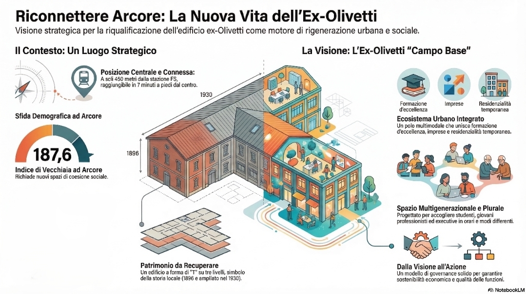 “A queste se n’è aggiunta una sesta che poi, nei fatti, va a riasumere tutte le altre – ha sottolineato l’assessore Corbetta durante la conferenza stampa, alla quale hanno partecipato anche molti cittadini che avevano preso parte ai tavoli organizzati in Villa Borromeo – Abbiamo ipotizzato un struttura che punta l’attenzione soprattutto su un mix, o meglio un ecosistema ibrido, nel quale far convivere corsi intensivi, serate e week end per professionisti e lavoratori, servizi welfare aperti alla cittadinanza, residenzialità temporanea, spazi di coworking, studio e socializzazione (per esempio al piano terra potrebbe trovare posto una libreria caffetteria sull’esempio della “Feltrinelli”, ndr). Ovviamente il focus di questo lavoro è sull’ex Olivetti ma non è escluso che il progetto possa coinvolgere anche altre strutture che si trovano accanto. Parlo del consultorio Ats di via IV Novembre (gli ambulatori si trasferiranno nella futura Casa di comunità al San Giuseppe, ndr), della vecchia palazzina che ospitava l’ex sede dell’Avis, l’area dell’ex Cinema Centrale (attualmente di proprietà privata ma che potrebbe essere trasformata dal prossimo Pgt, ndr). E poi ancora, chissà, magari l’ex chiesa dell’Immacolata dell’oratorio femminile di proprietà della parrocchia (un domani, se lo stabile dovesse essere ceduto al comune potrebbe ospitare laboratori artigianali). Senza dimenticare le Scuderie di Villa Borromeo (in parte occupatee dagli studenti di Brera, ndr) e il recupero dell’Hangar. Insomma questa struttura andrà a pieno regime quando verrà utilizzata per sette giorni su sette, 365 giorni all’anno e diventerà il fulcro di un progetto pià ampio sulla Arcore del futuro”.