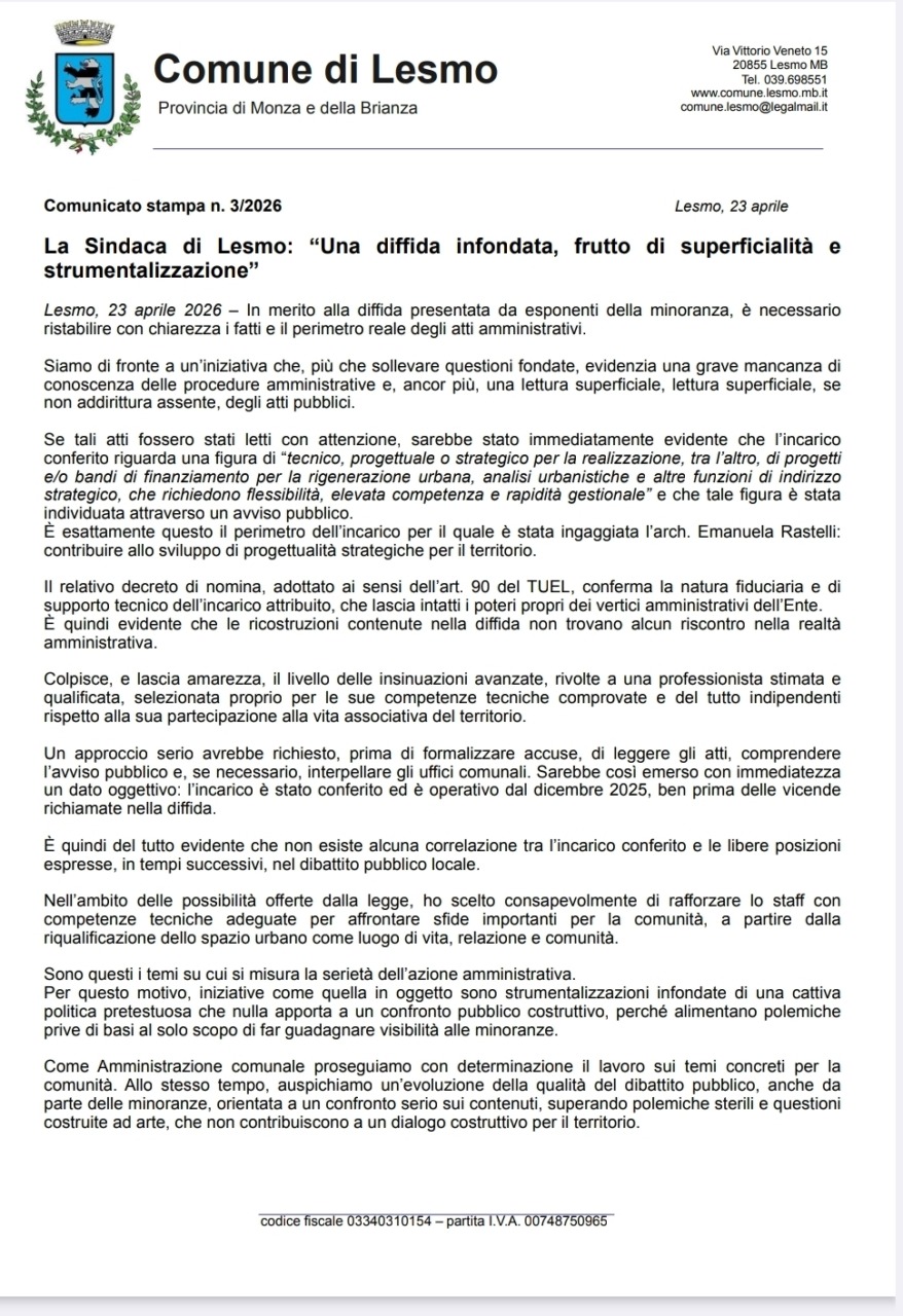 Non si placa la tensione politica a Lesmo. Al centro della polemica, la diffida presentata nei giorni scorsi dagli esponenti della minoranza riguardante l’incarico conferito all’architetto Emanuela Rastelli, presidente dell’Anpi di Arcore, assunta nello staff del primo cittadino di Lesmo Sara Dossola. Una mossa che il primo cittadino non ha esitato a definire come il frutto di una “cattiva politica pretestuosa”.