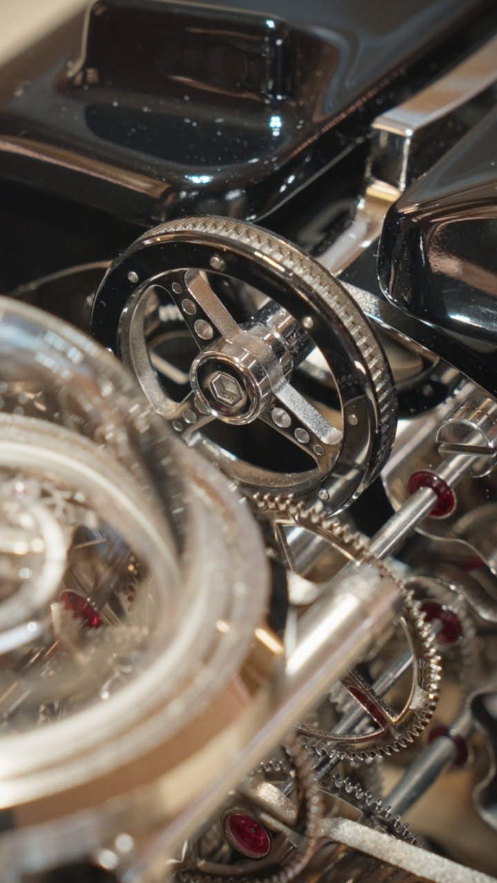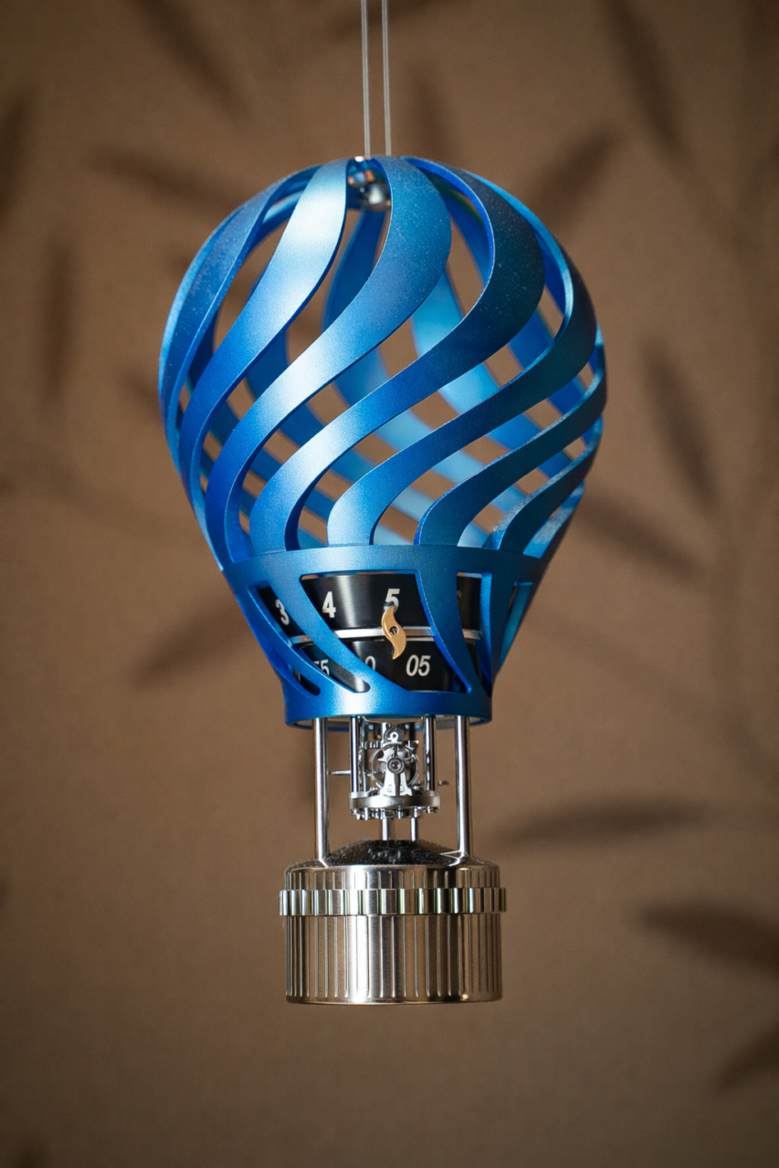 Da questo processo nascono segnatempo che assumono le sembianze di sculture dinamiche: mongolfiere ed auto d’epoca che coniugano rigore tecnico e visione artistica. Ogni pezzo è il risultato di centinaia di componenti assemblati a mano, dove la funzione oraria diventa parte di una narrazione più ampia.