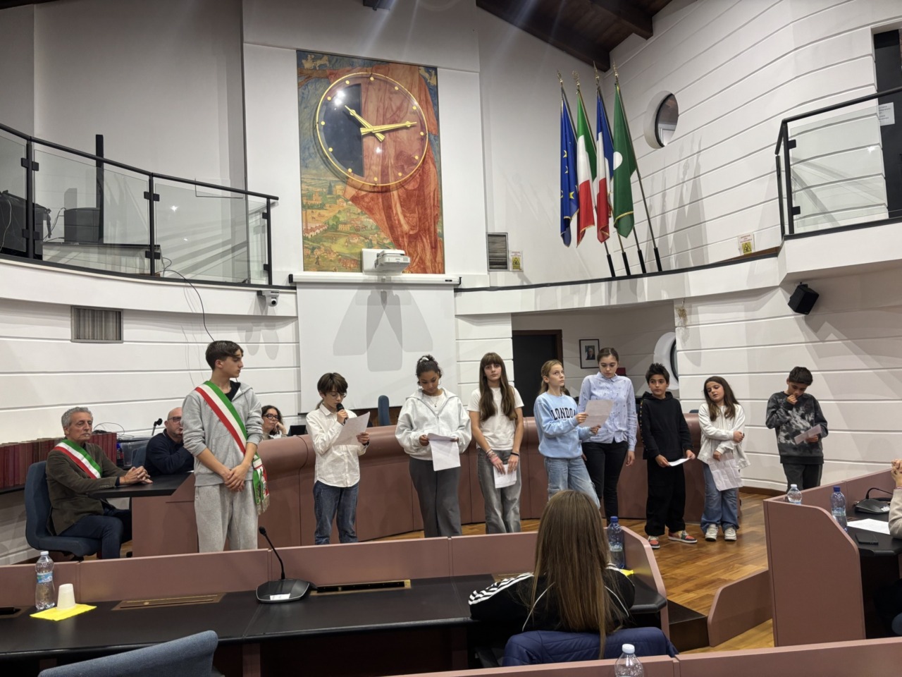 Nell’occasione alcuni neo consiglieri hanno eseguito in Aula una rappresentazione preparata a scuola recitando letture che hanno dato vita ai valori contenuti nella Costituzione Italiana.