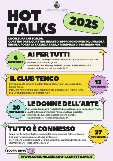 Nasce così “Hot Talks – La cultura che scalda”, la nuova rassegna promossa dall’Amministrazione comunale per il mese di novembre: quattro appuntamenti serali per scoprire, dialogare e lasciarsi incuriosire da argomenti attuali e coinvolgenti.