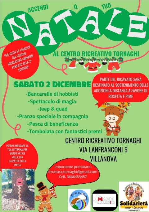 Sabato 2 dicembre 2023, presso il Centro Ricreativo Tornaghi, l’Associazione Ponte tra i Popoli organizza Accendi il tuo Natale con bancarelle, spettacoli e molto altro. Parte del ricavato sarà devoluto a Solidarietà con Gusto, iniziativa ideata a Bernareggio per sostenere progetti di adozione a distanza realizzati da nostri concittadini nei Paesi in via di sviluppo, per l’edizione 2023 si presenta in una nuova veste.