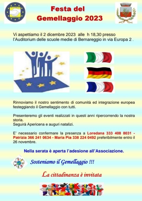 L’Associazione Comitato per il Gemellaggio di Bernareggio e della Brianza APS, con il patrocinio del Comune di Bernareggio, organizza inoltre, sempre per sabato 2 dicembre, la Festa del Gemellaggio 2023. Appuntamento dalle 18.30 presso l’Auditorium delle Scuole Medie, via Europa. Ripercorrendo la storia del Gemellaggio con La Villedieu du Clain (FR) e Wachtberg (GER), saranno illustrati gli eventi realizzati in questi anni. Seguiranno apericena e auguri natalizi.