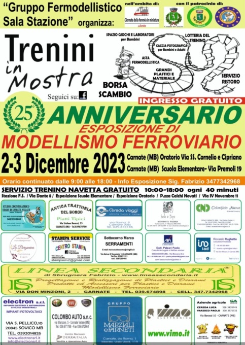 Sabato 2 e domenica 3 dicembre, 25esima edizione della “Trenini in mostra”. E’ tutto pronto a Carnate per il tradizionale appuntamento con «Trenini in mostra», l’esposizione di plastici, diorami e modellini ferroviari che quest’anno raggiunge la stazione della 25esima edizione. Un’iniziativa che ormai fa parte della storia di Carnate e che fonda le proprie radici alla fine degli anni ‘90, quando l’allora parroco don Giovanni Verderio chiese ad alcuni volontari di mettere in piedi qualcosa che potesse attrarre più ragazzi in oratorio. All’appello risposero alcuni «giovanotti» dell’epoca, che proposero una serie di laboratori manuali, tra cui proprio quelli dedicati alla realizzazione di modellini e plastici.