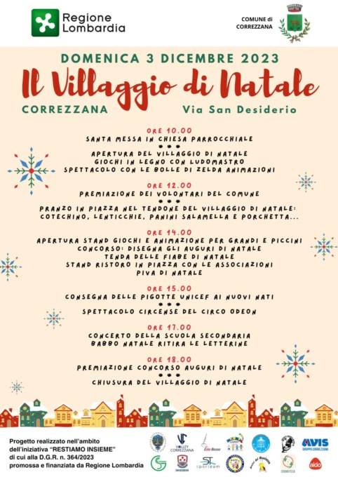 Domenica 3 dicembre apre il Villaggio di Natale. Dalle ore 11.00 alle ore 18.00 lungo via San Desiderio tante proposte per grandi e piccini per accendere l’atmosfera natalizia. Durante la giornata saranno premiati anche i volontari del Comune (ore 12), saranno consegnate le pigotte dell’Unicef ai nuovi nati (ore 15) e infine saranno premiati anche i vincitori del concorso “Auguri di Natale” (ore 18). Alle 17 arriverà Babbo Natale, a cui tutti i bambini potranno consegnare la propria letterina.