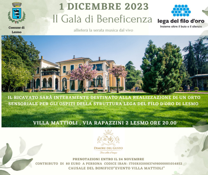 Venerdì 1 dicembre invece seconda edizione del “Gala di Beneficenza” in Villa Mattioli. Cene benefica il cui ricavato verrà devoluto alla Lega del Filo d’Oro per la realizzazione di un orto sensoriale nel giardino della struttura di Lesmo.